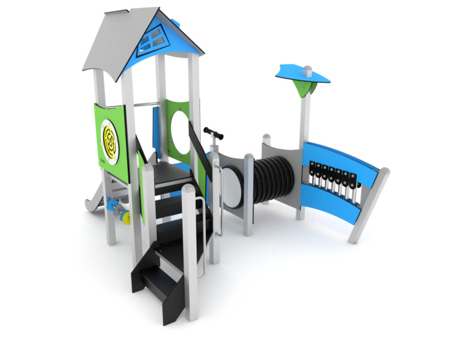 Aktivitetstårn for små børn med 1 tårn, trappe, legepaneler, rutsjebane i rustfrit stål m.m. Materiale: pulvergalvaniseret og pulverlakeret stål. Platforme i HPL, paneler i multifarvet HDPE. Forankring til nedstøbning medfølger. Ved installation skal den medfølgende manual altid følges. Den nyeste version kan rekvireres på forespørgsel.