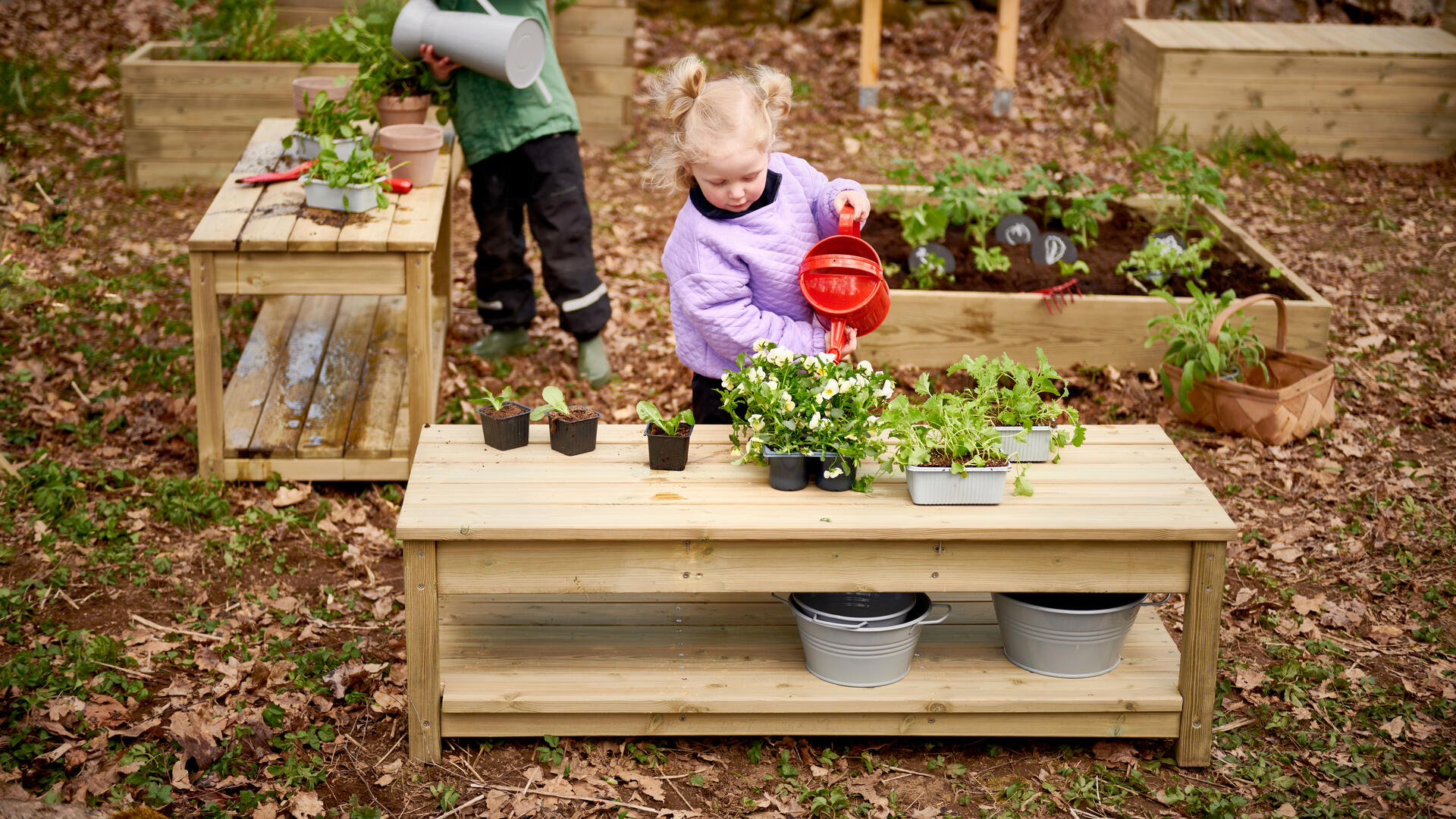 Et alsidigt plantebord i robust konstruktion, der er en perfekt hjælp, når børn skal plante planter. Det robuste bord har desuden en praktisk opbevaringshylde under. Bordet fungerer også perfekt til at samles omkring, øve sig i samarbejde, foregive leg, eller som arbejdsbord, laboratoriestation, tømrerbænk mv. Leveres færdigsamlet. Monteringsløsning til jordforankring medfølger.