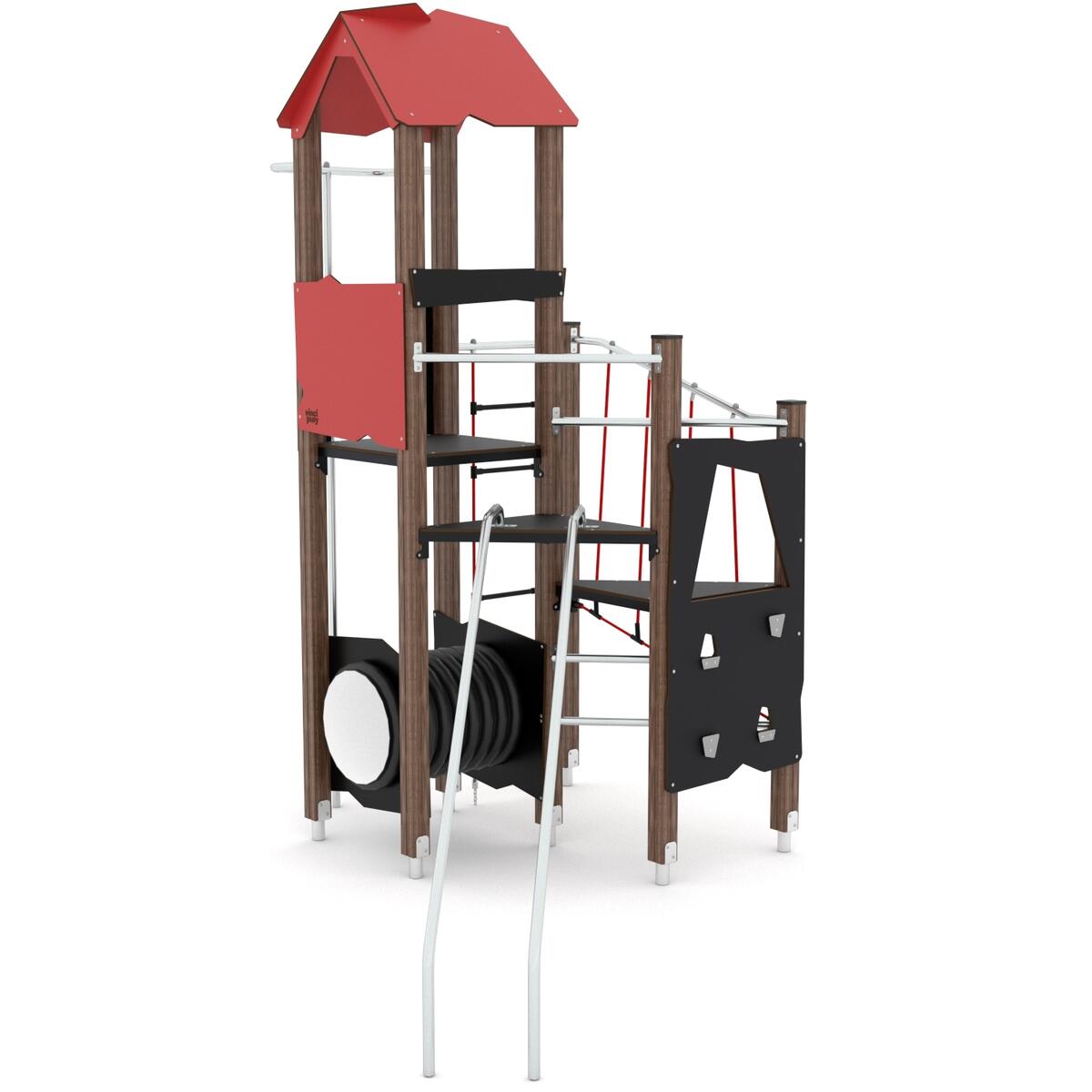 Aktivitetstårn med 2 glidestænger, klatrevæg, klatrereb, brandmandsstang og tunnel. Vælg mellem paneler i HDPE (multifarvede) eller HPL (øvrige farver). Ved installation skal den medfølgende manual altid følges. Den nyeste version kan rekvireres på forespørgsel. K1 forankring medfølger som standard.