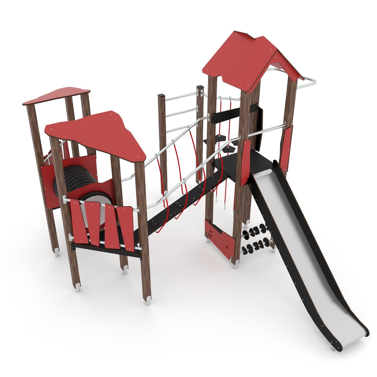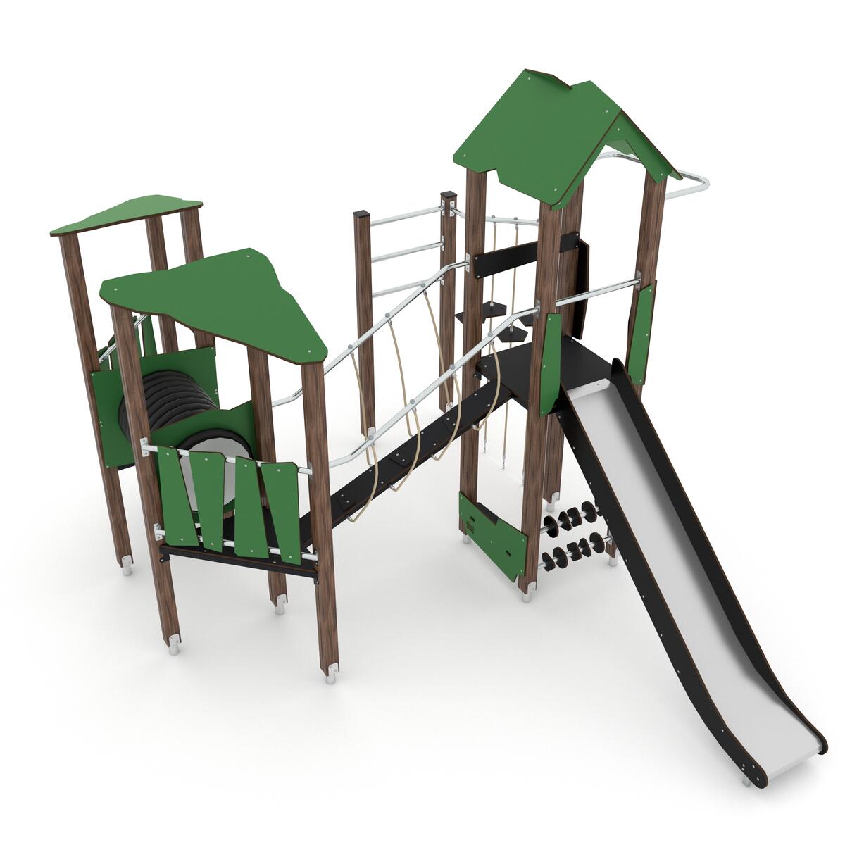 Multilegeplads med trapper, legepaneler, vindue, to platforme forbundet via bro og to rutsjebaner i rustfrit stål. Materiale: imprægneret, lamineret fyrretræ. Platforme i skridsikker og vandafvisende krydsfinér. Paneler i HDPE ved multifarvet og øvrige farver i HPL. Ved installation skal den medfølgende manual altid følges. Den nyeste version kan rekvireres på forespørgsel. K1 forankring medfølger som standard.