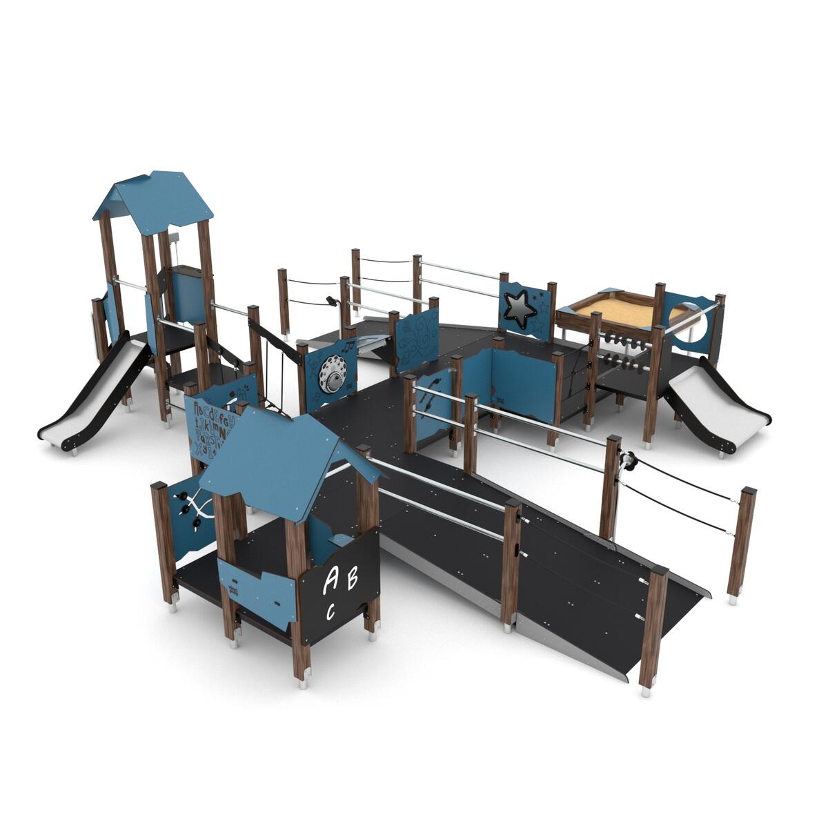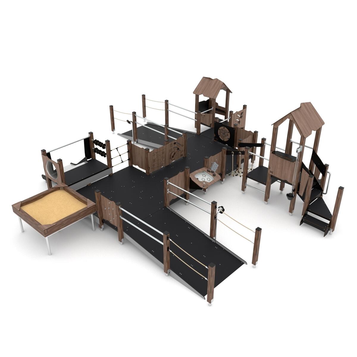 Medium kombinationslegeplads som er tilgængelig for alle. Sandkasse, legepaneler, sandkran, rebbro, trapper, tilgængelige platforme m.m. Rutsjebane i rustfrit stål. Materiale: imprægneret, lamineret fyrretræ. Platforme i skridsikker og vandafvisende krydsfinér. Paneler i HDPE ved multifarvet og øvrige farver i HPL. Forankring til nedstøbning medfølger. Ved installation skal den medfølgende manual altid følges. Den nyeste version kan rekvireres på forespørgsel.