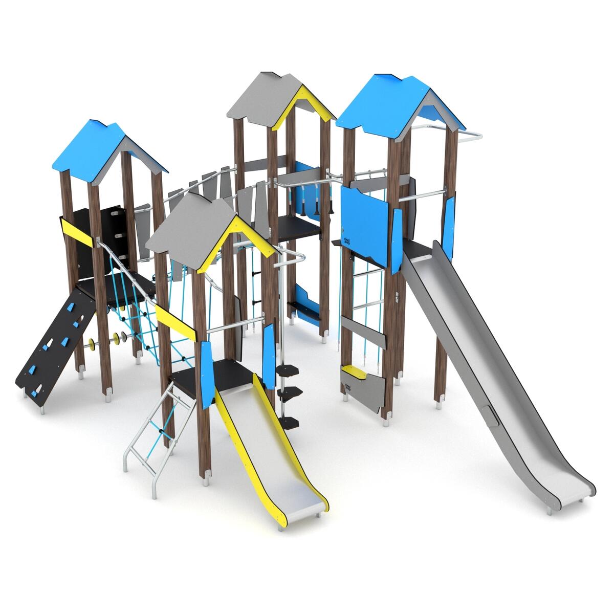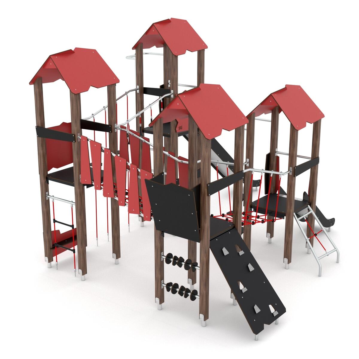 4 aktivitetstårne med 2 rutsjebaner, 2 typer broer, klatrevæg og rebstige. Vælg mellem paneler i HDPE (multifarvede) eller HPL (øvrige farver). Forankring til nedstøbning medfølger. Ved installation skal den medfølgende manual altid følges. Den nyeste version kan rekvireres på forespørgsel.