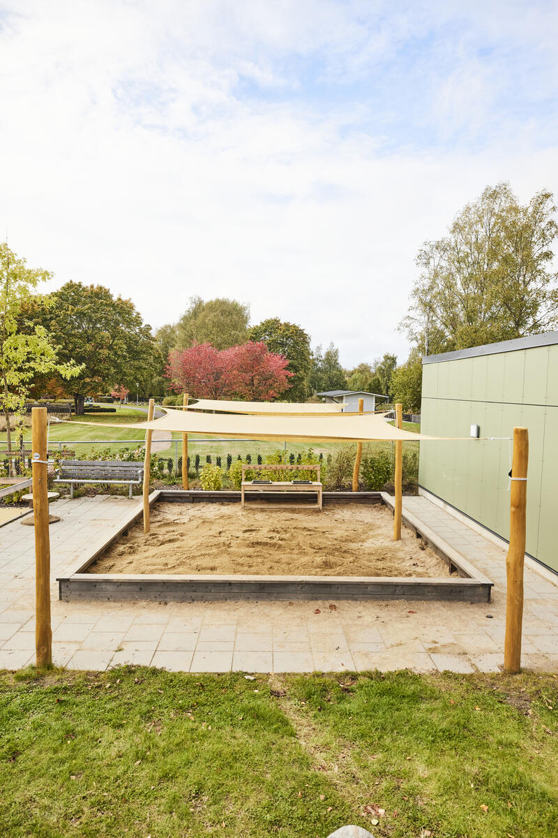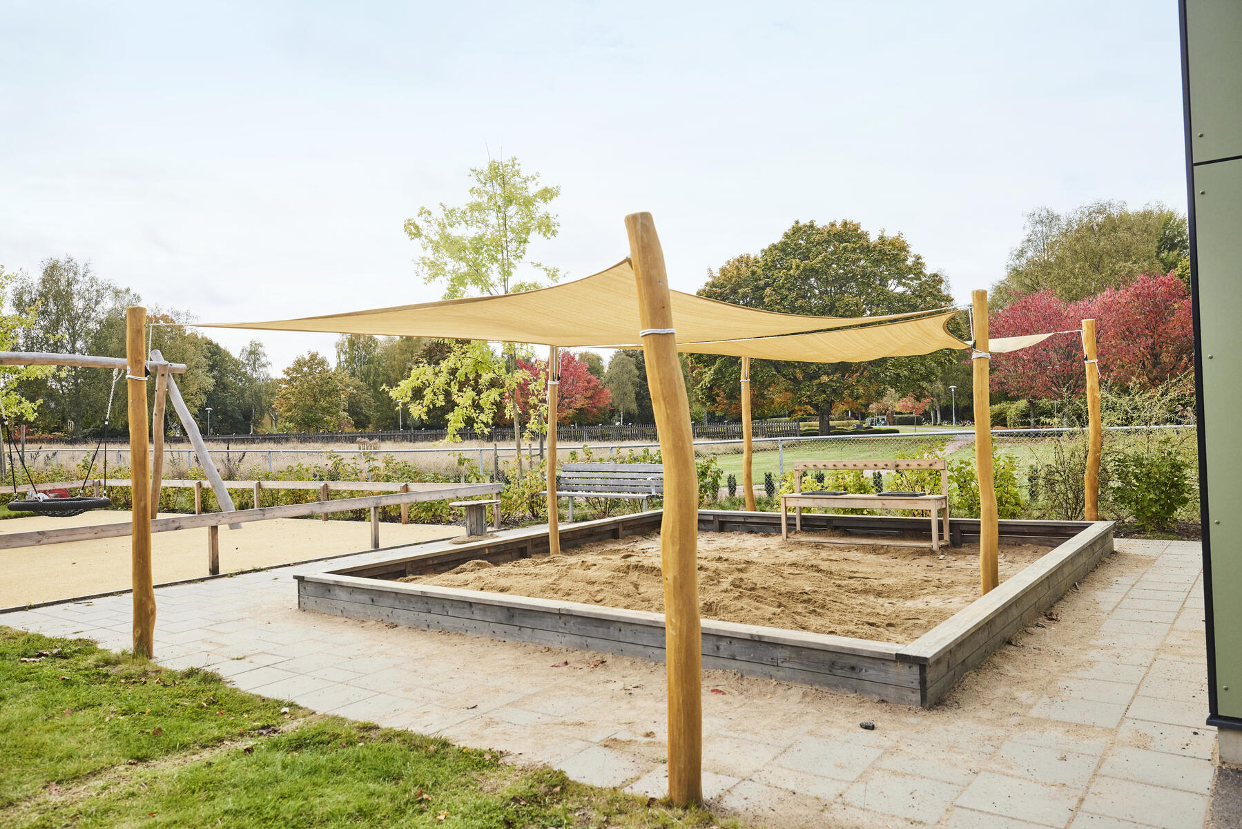 Et komplet solsejlsystem til fx daginstitutioner og skolen som giver en dejlig kølende skygge på varme dage og beskytter mod solens stærke UV-stråler. Solsejlet skaber muligheder for at indrette rum i det udendørs miljø og giver gode betingelser for at forlænge tiden udendørs. Let regn og vind kan trænge igennem dugen. Dugen er ikke modstandsdygtig over for sne, og for at forlænge levetiden anbefales det, at den tages ned om vinteren. Dugen er fremstillet af kraftig vævet HDPE der blokerer 90% af solens skadelige UV-stråler. Sættet består af 6 stolper Ø10-14 cm af FSC-certificeret robinietræ, ophængssæt og solsejl. Stolperne er mærket med niveau 0.