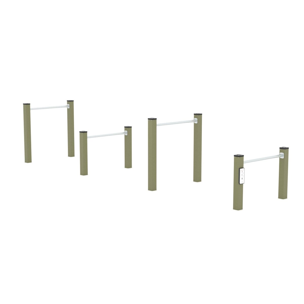 Udendørs træningsredskab der opbygger muskler. Styrker bryst-, skulder- og armmuskler. Farven sølv har en base i rustfrit stål. Alle andre farver er i pulvergalvaniseret og pulverlakeret stål. Mobilholder i polycarbonat og HDPE. K3 forankring medfølger.