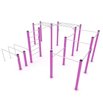 Workout-serien er en række træningsredskaber, der primært er beregnet til træning med kropsvægten som udgangspunkt. Konstruktionen er i pulver galvaniseret og pulverlakeret stål. Farven sølv (-99) er udelukkende af rustfrit stål. Klatrenettet er af stålforstærket polypropylen. Håndtag og kæder af rustfrit stål. Redskabet er udstyret med et aluminiumskilt skruet fast på en HDPE-plade med træningsinstruktioner og QR-kode, der fører dig til en kort video med instruktioner. Forankring til nedstøbning medfølger.