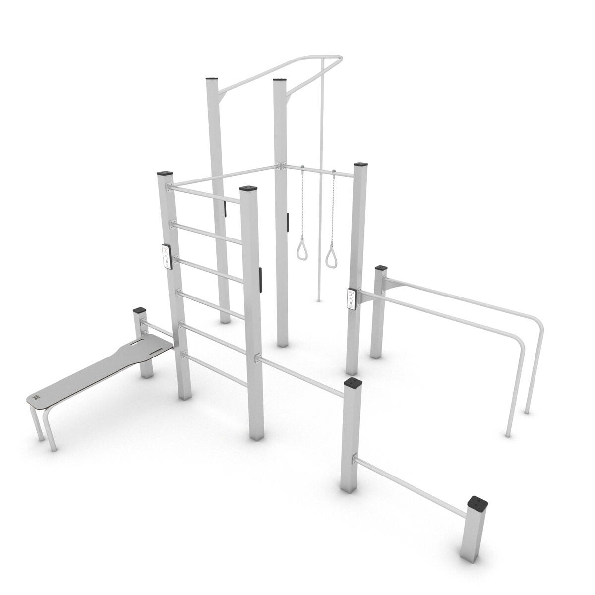 Workout-serien er en række træningsredskaber, der primært er beregnet til træning med kropsvægten som udgangspunkt. Konstruktionen er i pulver galvaniseret og pulverlakeret stål. Farven sølv (-99) er udelukkende af rustfrit stål. Redskabet er udstyret med et aluminiumskilt skruet fast på en HDPE-plade med træningsinstruktioner og QR-kode, der fører dig til en kort video med instruktioner. Forankring til nedstøbning medfølger.