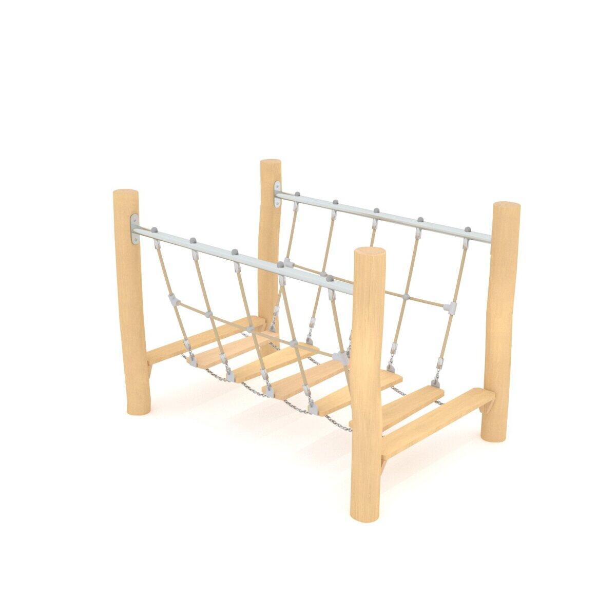 Hængebro, der hjælper med at træne børns motorik. Robiniatræet stammer fra langsomtvoksende europæiske robinietræer. Træet er naturligt meget modstandsdygtigt over for svamp og råd og kræver derfor ikke imprægnering for at modstå det nordiske klima. Den langsomme vækst gør robiniatræ til et bæredygtigt valg med høj styrke og lang levetid. Ved installation skal den medfølgende manual altid følges. Den nyeste version er tilgængelig på forespørgsel. K21 forankring medfølger som standard.