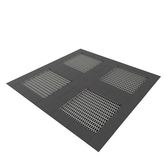 Hopperedskab med fire sammensatte kvadratiske hoppeflader der hver måler 100x100 cm. og med afsluttende gummikant. Redskabet er til nedgravning og beregnet til fire brugere. Se produktblad for materialespecifikation og anden info. Ved installation skal den medfølgende manual altid følges. Den nyeste version kan rekvireres på forespørgsel.