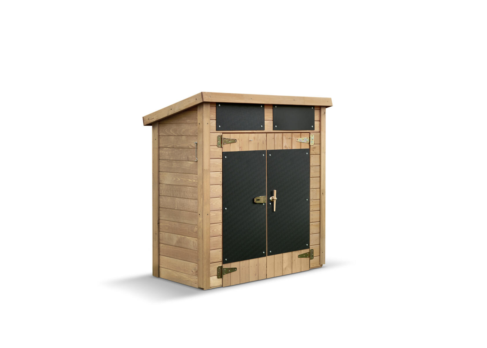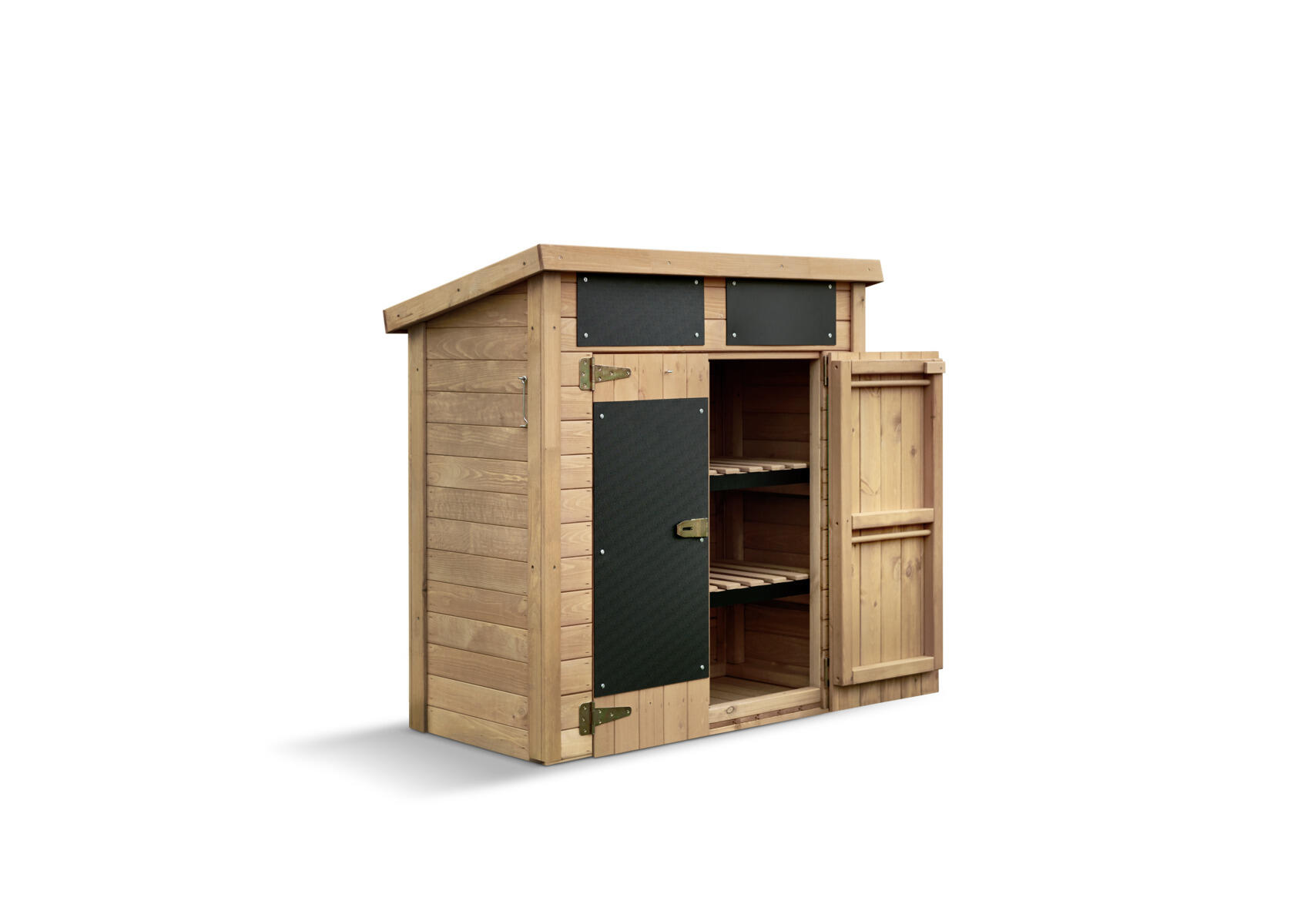 Forankringsløsninger sælges separat: til vægforankring kræves 2 stk. varenummer 151133, og til jordforankring kræves 4 stk. varenummer 151134. Skabet leveres samlet – kun taget skal monteres. Fremstillet af FSC-certificeret fyrretræ.