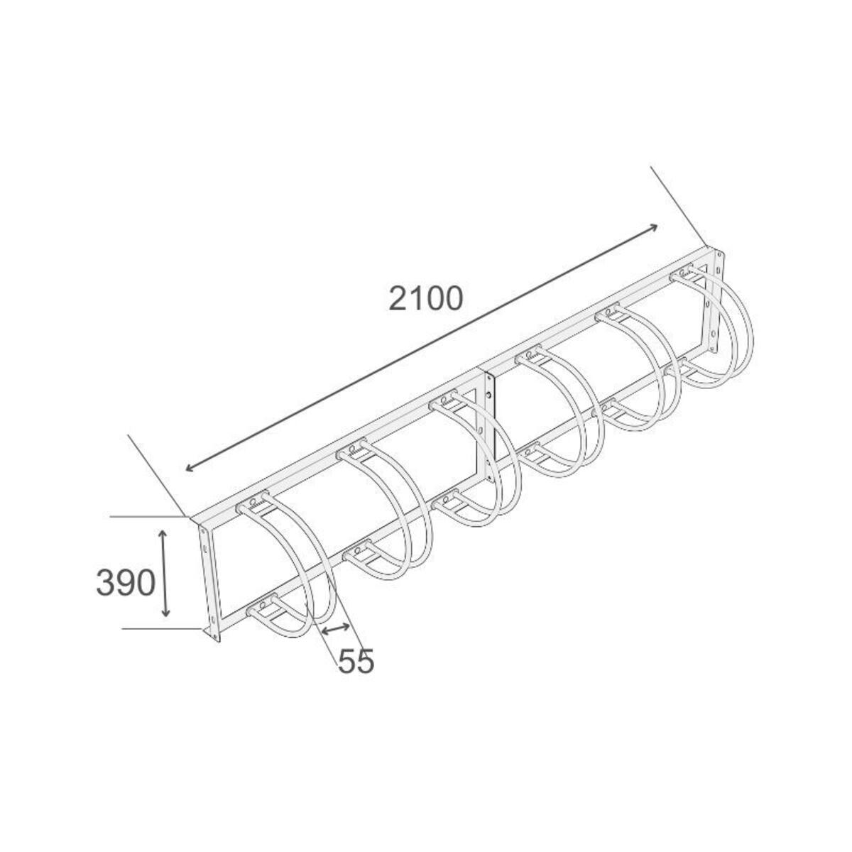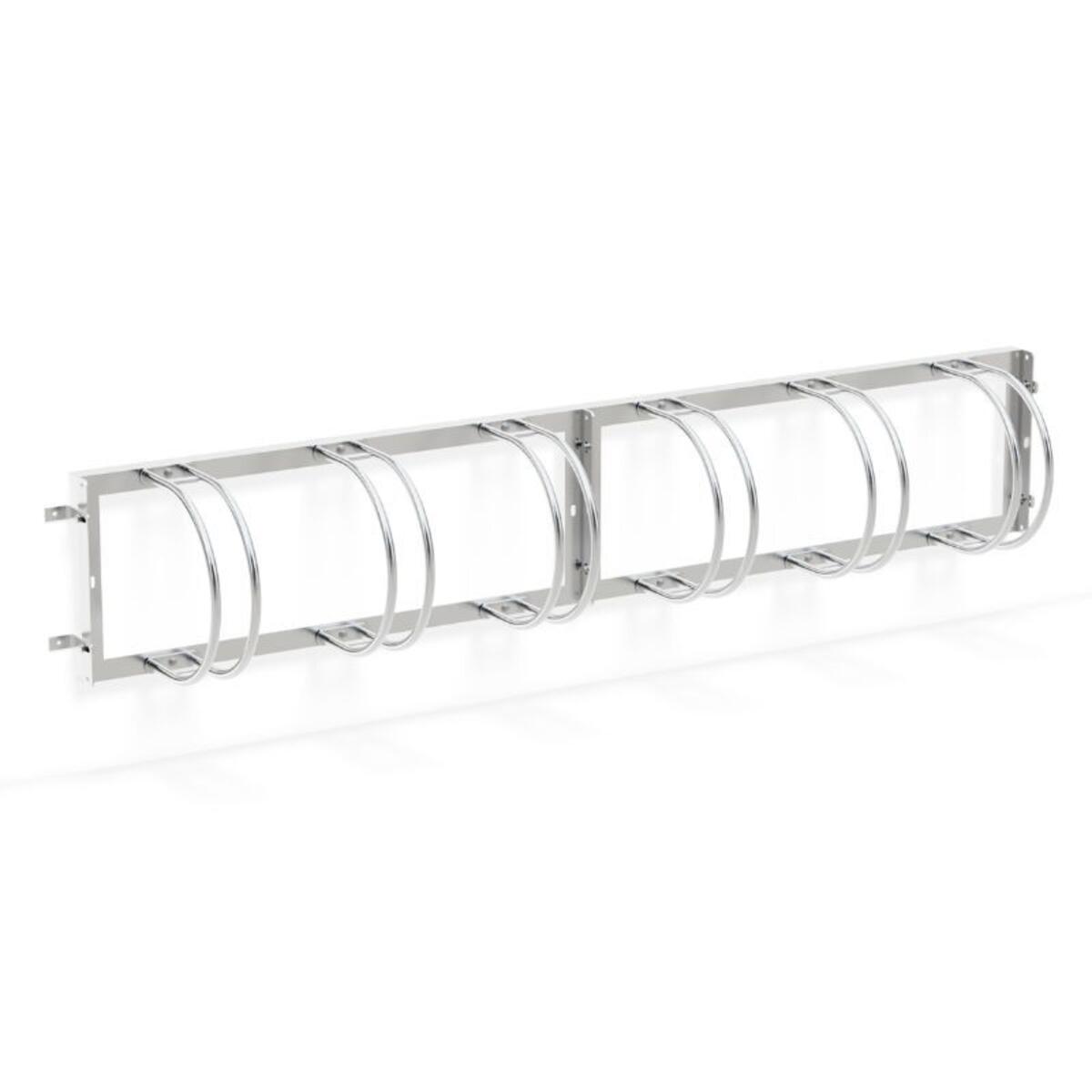 Væghængt cykelstativ til 6 cykler. Passer til dækbredde op til 55 mm. Fremstillet i galvaniseret stål.