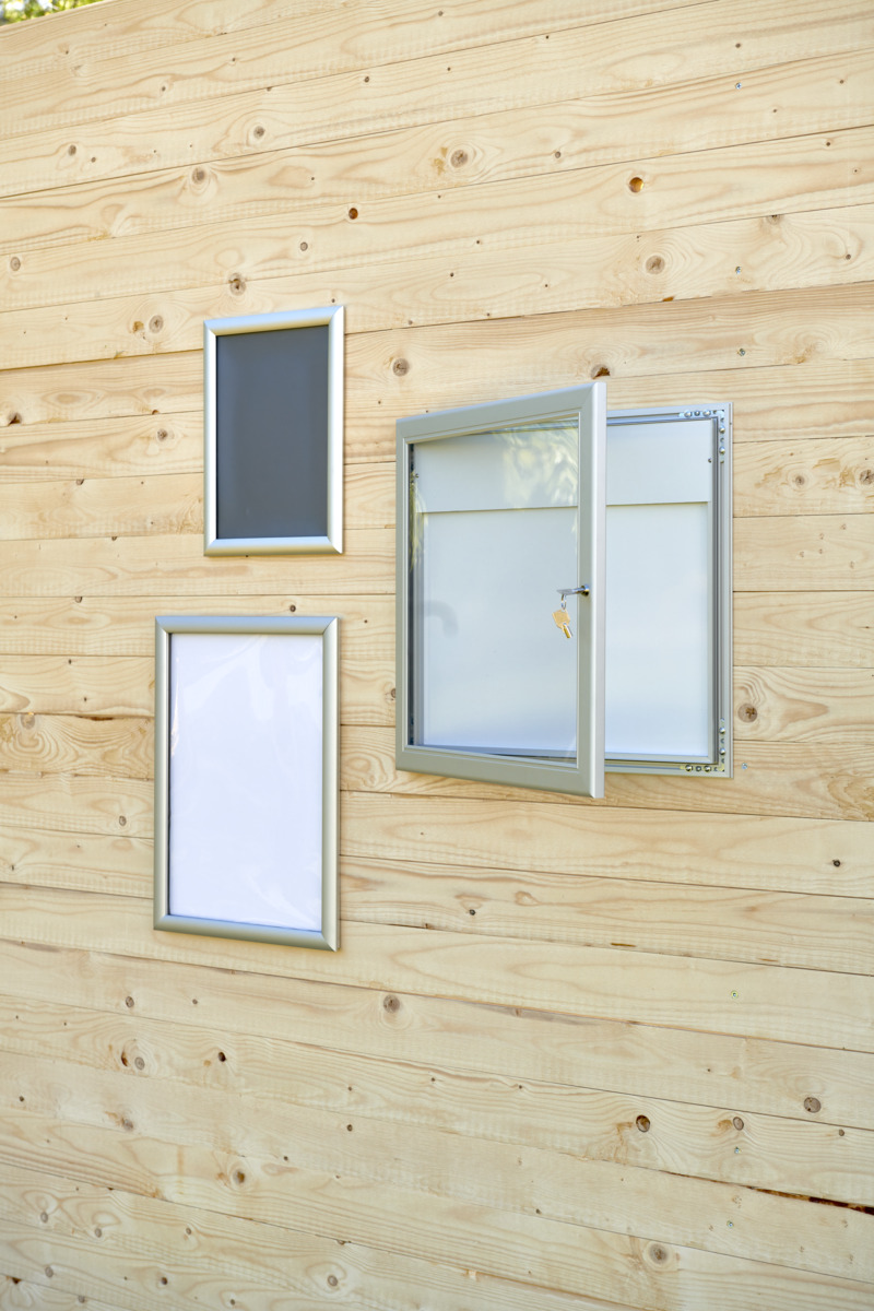 Disse rammer er designet til udendørs brug og beskytter mod vejr og vind, samtidig med at de gør det lettere at dokumentere og informere i udemiljøet. De er ideelle til at synliggøre børnenes arbejde, dele ugens aktiviteter, give tips til hvordan miljøerne eller legeredskaberne kan bruges, eller til anden vigtig information. Rammerne er monteret med skumlister under profilerne, hvilket forhindrer vand i at trænge ind. Rammernes smarte snapfunktion gør det nemt at udskifte indholdet. Leveres med skruer og rawlplugs.