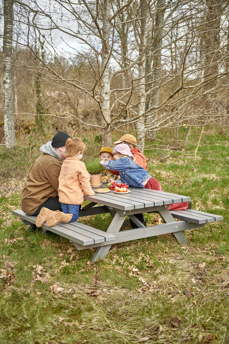 Et solidt picnicbord i massivt træ. Perfekt til de mindre børn i både børnehaven og skolen, hvor det fungerer som et hyggeligt mødested i udemiljøet med plads til 6 personer. Sættet er fremstillet af FSC ® -certificeret Norrlandsfyr, 40 mm. For den bedste holdbarhed anbefaler vi, at den olierede udgave olieres regelmæssigt, du kan finde vores vedligeholdelsesråd på vores hjemmeside.