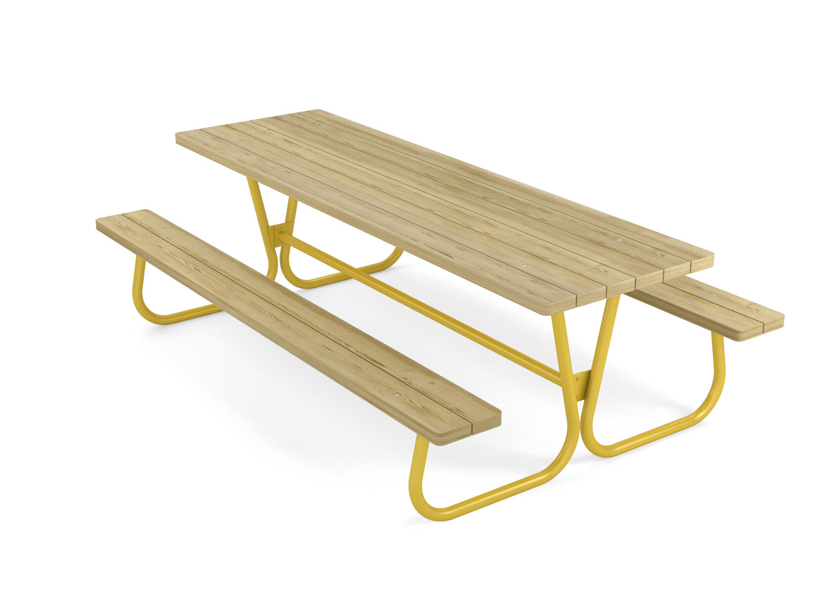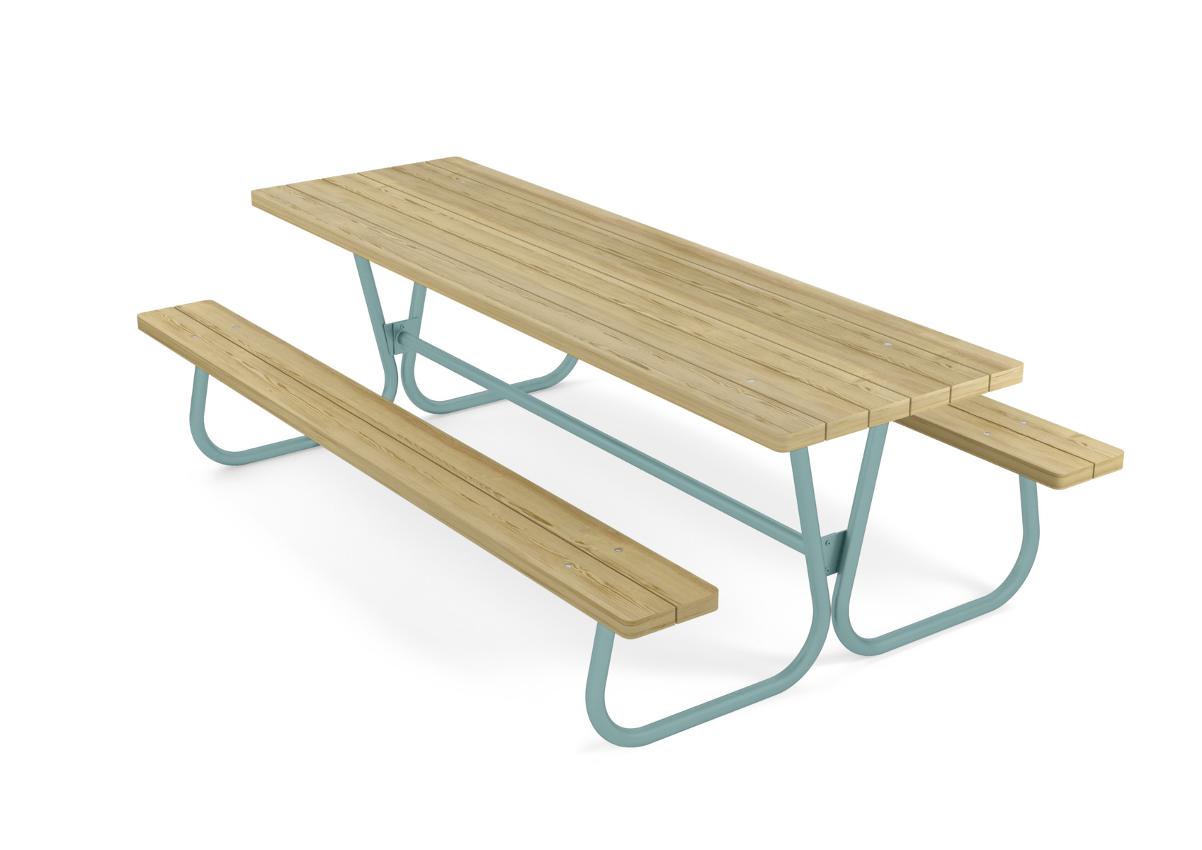 Denne model er med varmgalvaniseret stel af stål og findes i otte forskellige farver. Bord- og siddeplads i olieret fyrretræ. Siddehøjde 44 cm,