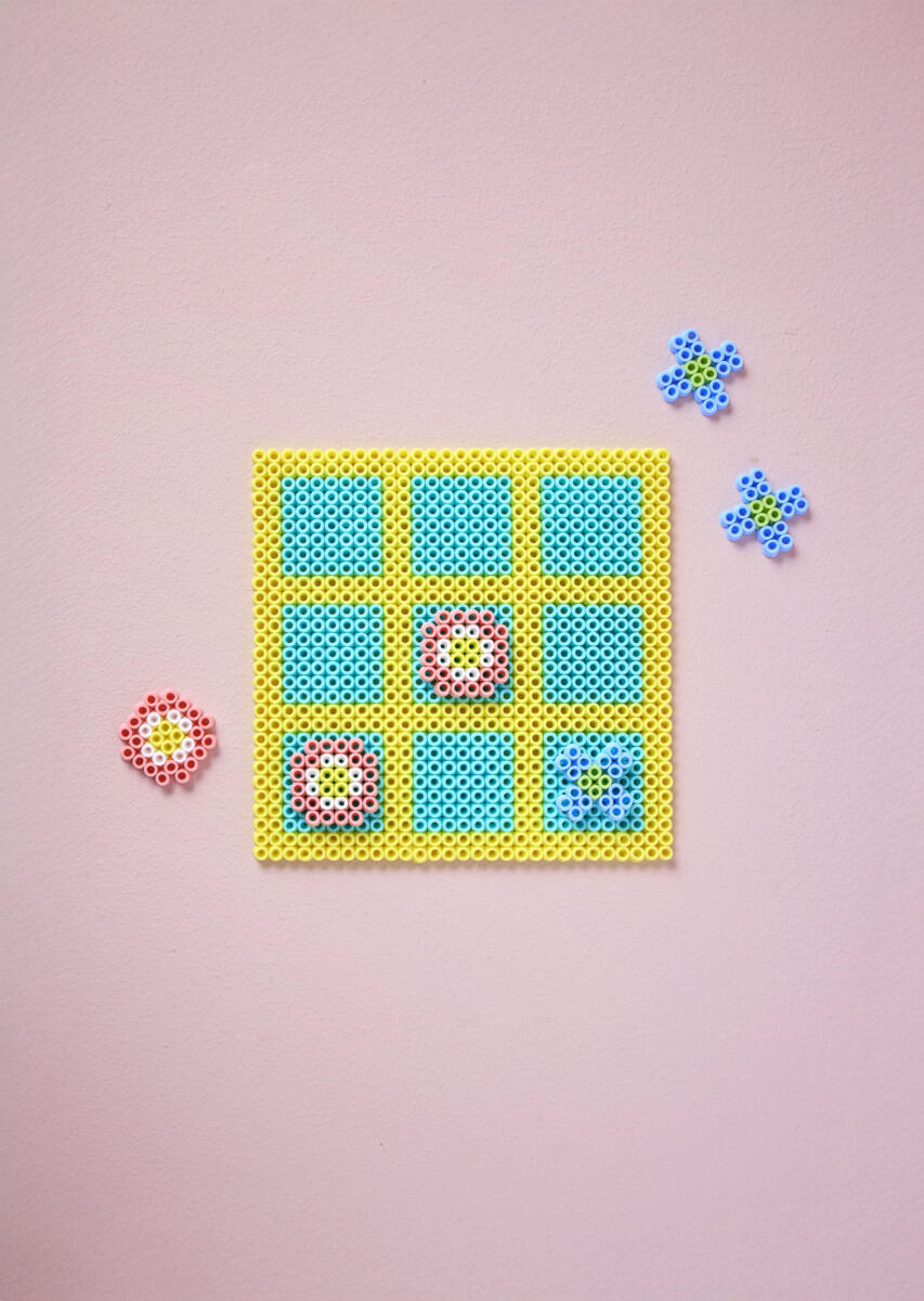 - Læg bagepapir over, og stryg med et strygejern, indtil perlerne er smeltet sammen. OBS: Få hjælp af en voksen, når der skal stryges. Både strygejern og perler bliver meget varme. Læg noget tungt ovenpå, og lad det køle af. Hvis I vil undgå varme, kan I i stedet bruge limark til at samle perlerne.