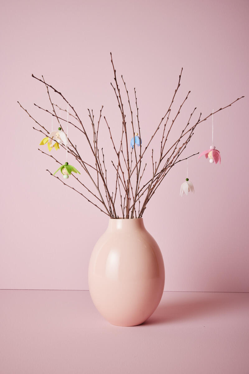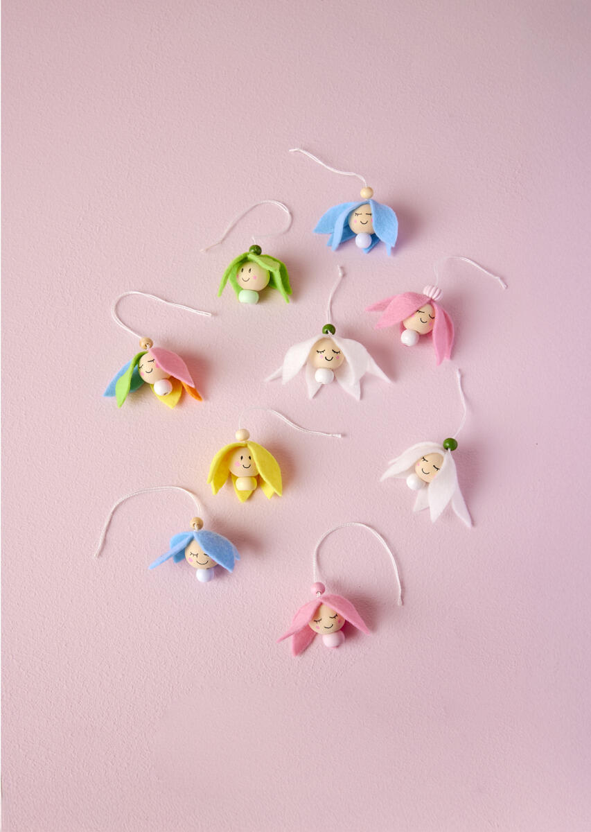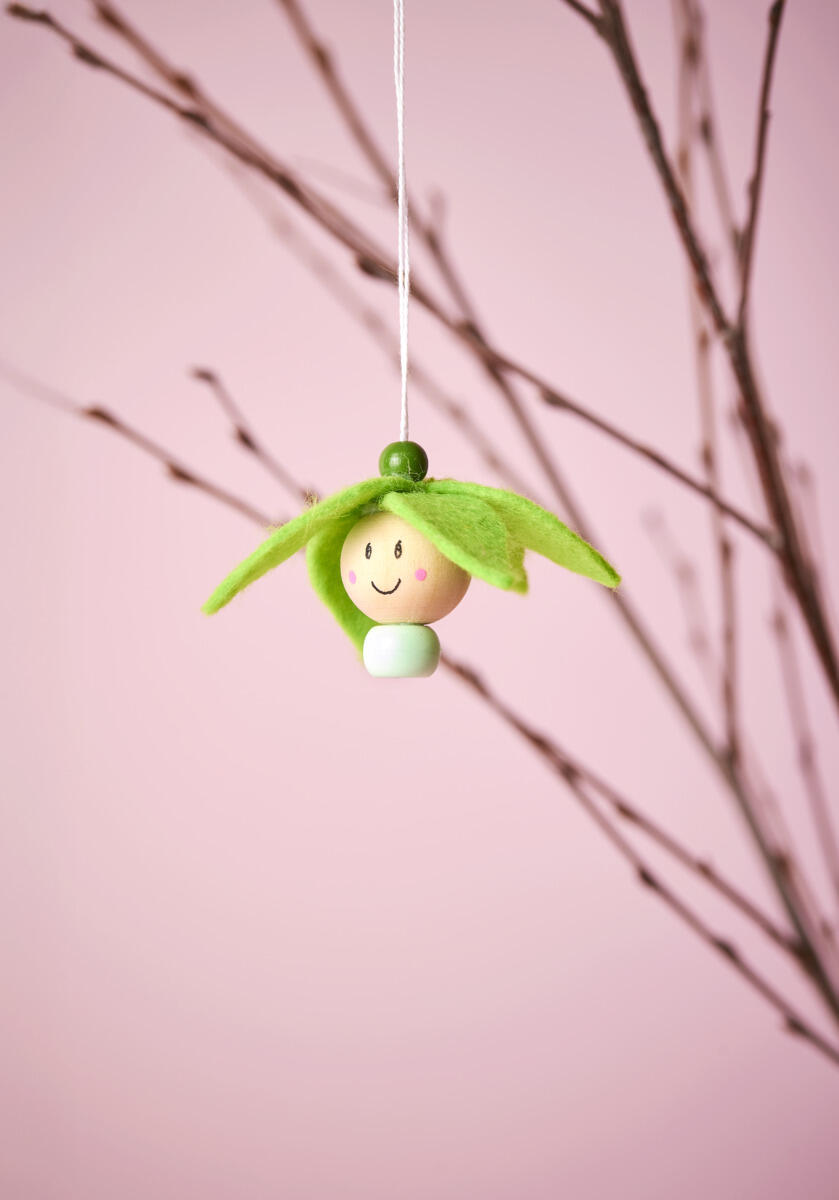 - Klip blomsterblade ud af dekorationsfilt. Lim bladene fast rundt om kuglen, men lad en lille åbning være fri ved ansigtet.