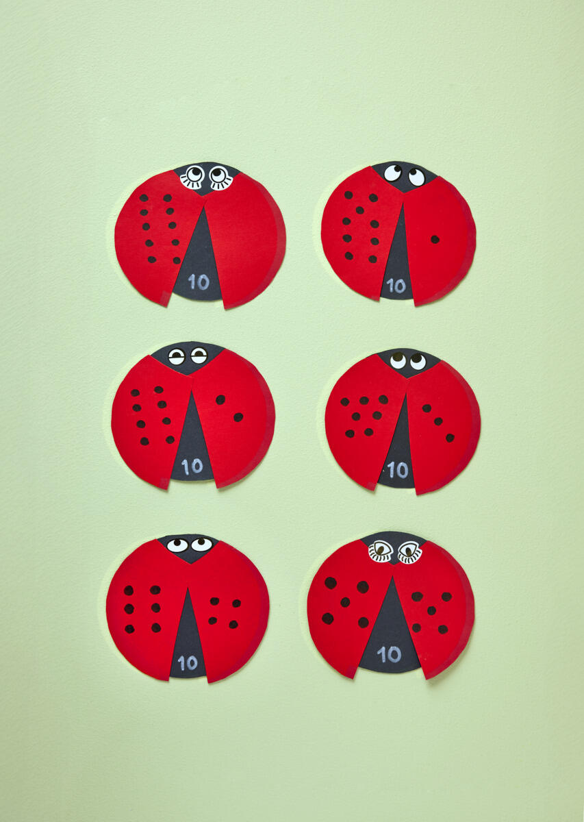 - Tegn derefter 10 sorte prikker på vingerne, fordelt på forskellige måder. På den første kan alle 10 prikker være på venstre vinge ā det viser 10+0=10. På den næste kan der være 9 prikker på venstre vinge og 1 på højre (9+1=10). Fortsæt med 8+2=10, 7+3=10, 6+4=10 og 5+5=10.