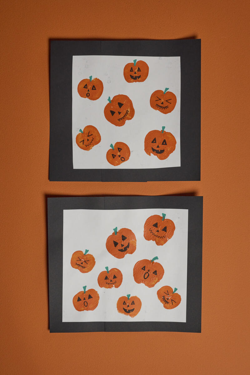 - Tegn ansigter på græskarrene med en sort tusch, og tegn en græskartop med en grøn tusch.