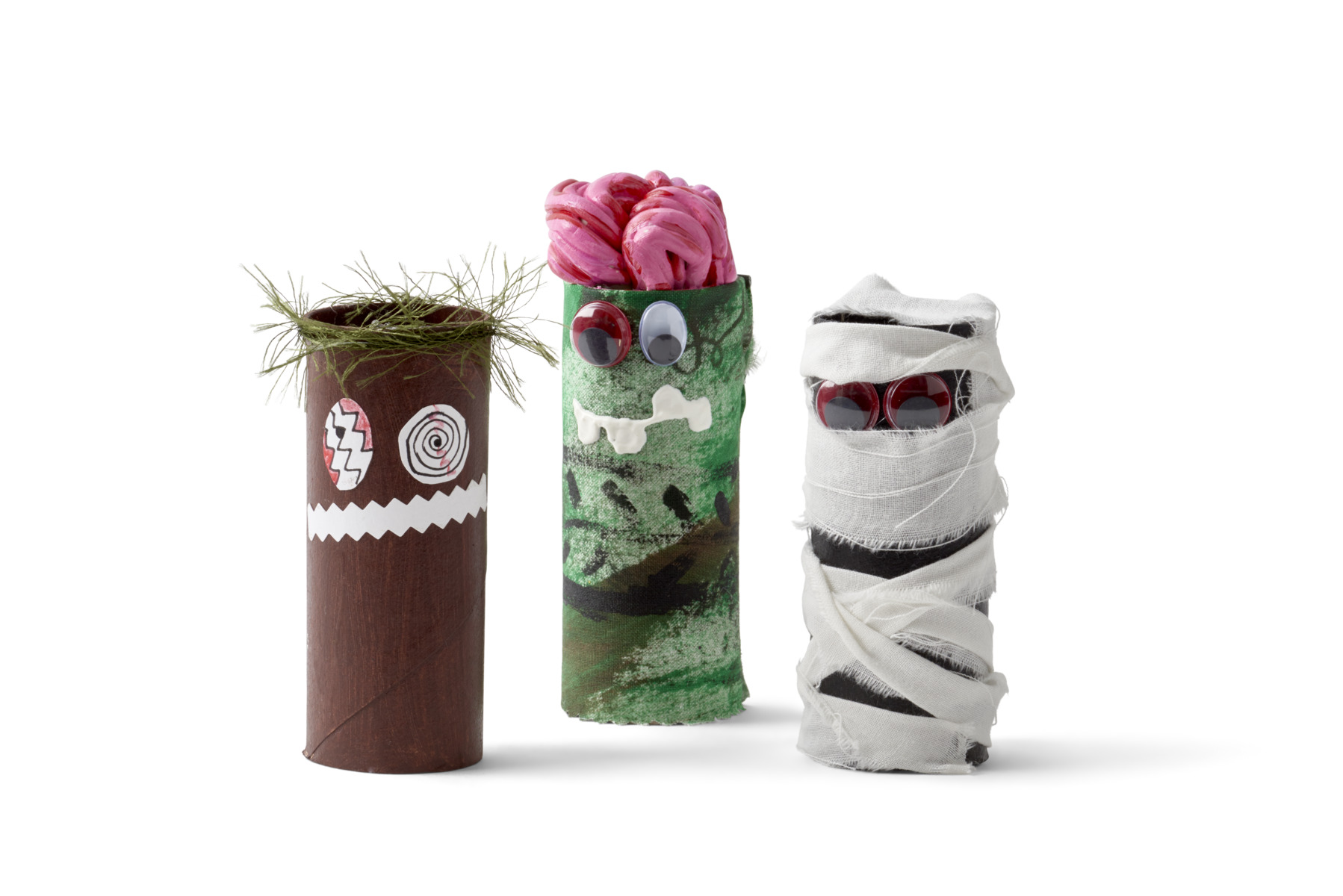 Mal og pynt paprullerne til små monstre. Brug gerne stof, plastøjne, garn og ler - og slip fantasien løs!