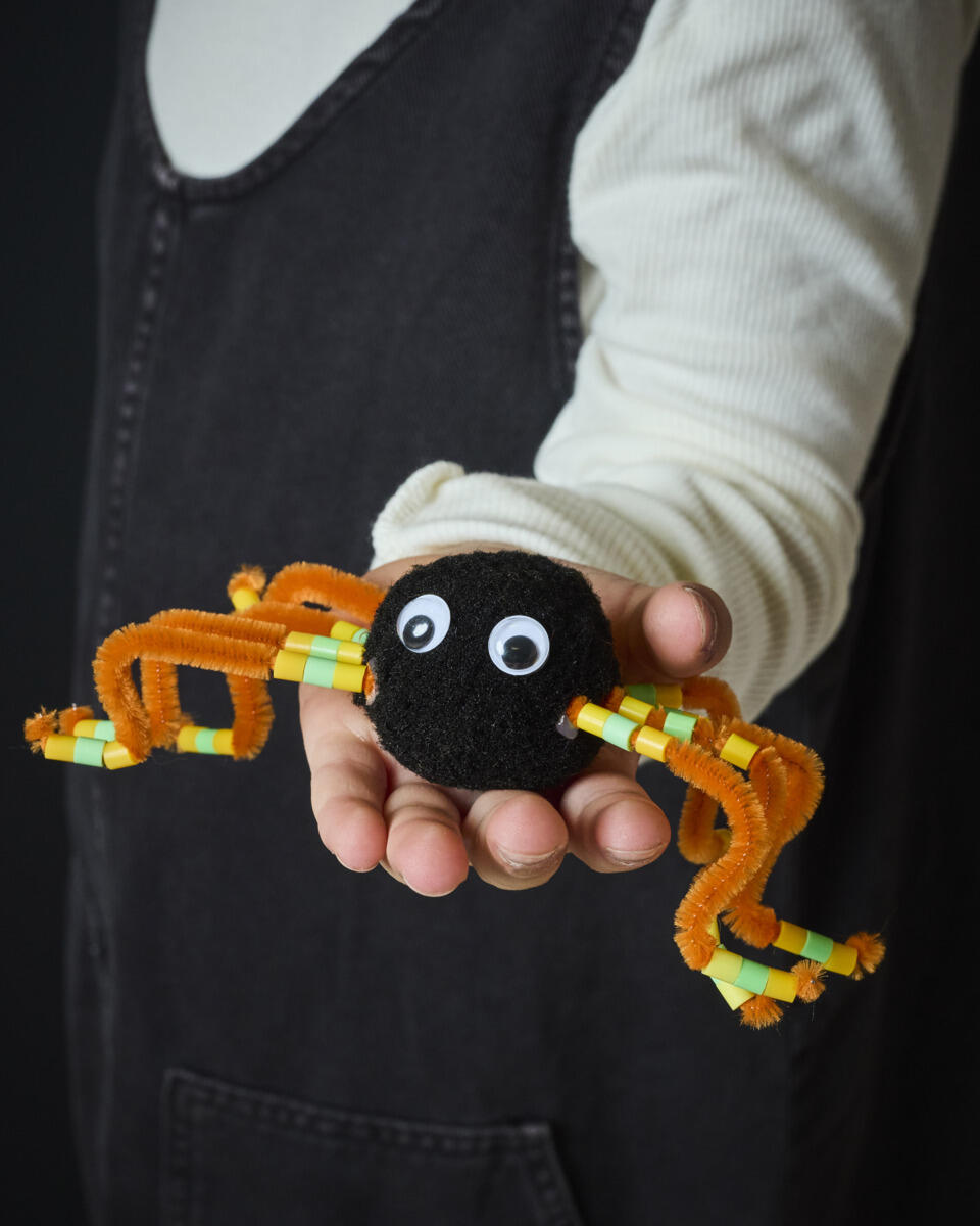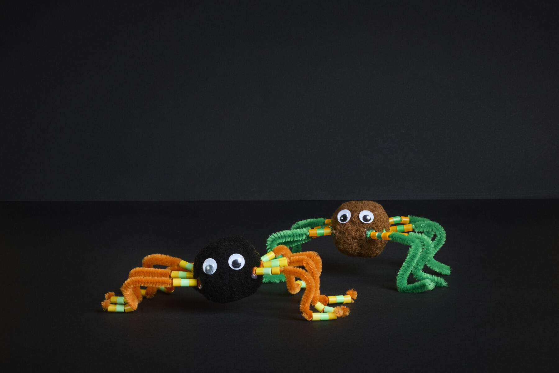 - Sæt tre rørperler i valgfri farve på hvert ben, bøj piberenserne, så de ligner spindelben, og sæt derefter tre rørperler for enden.
