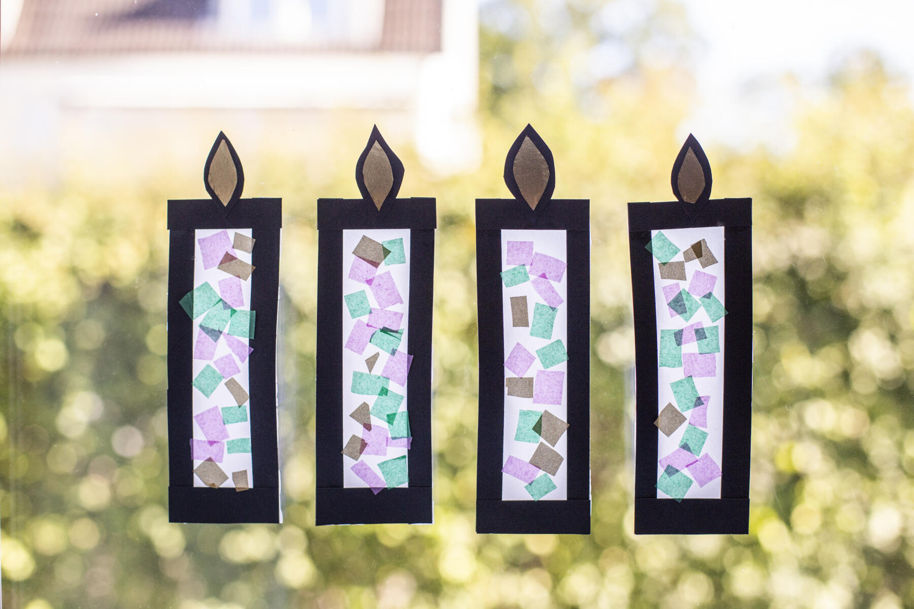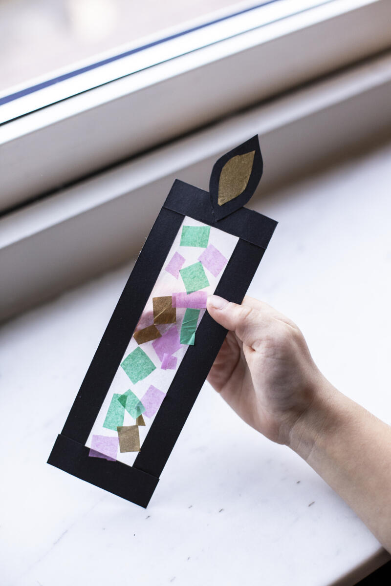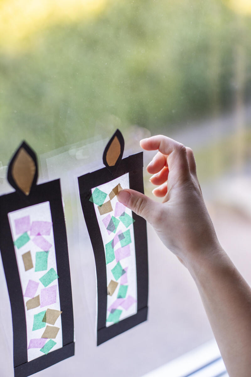 - Klip små stykker silkepapir i forskellige farver til at lave mosaik, og klip en indre flamme ud, som skal placeres inde i den sorte flamme. Lim en bagside på rammen – vi valgte hvidt silkepapir, så lyset kan skinne igennem.