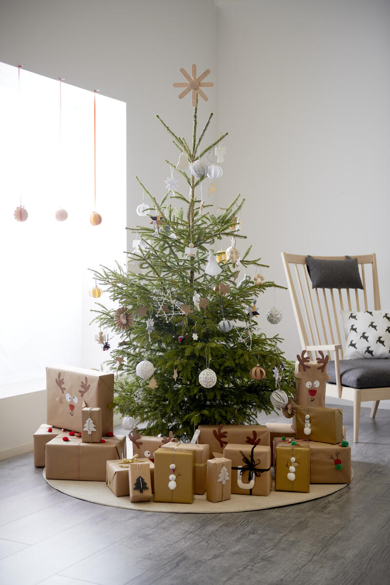 Lim tre træpinde sammen som en stjerne og lim derefter en knappeform fast i midten. Lim stjernen fast i toppen af træet. Vi har anvendt en limpistol.