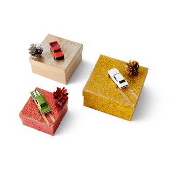 - Lav bilspor ved at sætte dobbeltsidet tape på æsken og derefter pensle hele æsken med flydende lim og hælde glitter på. Lad det tørre.