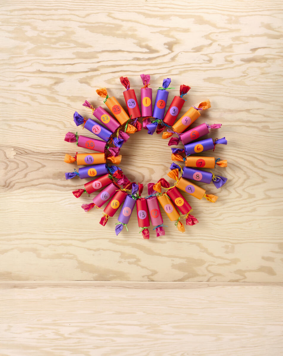 - Et tip: Lav en cirkelbund af pap, som knallerterne kan limes på – det hjælper med at holde formen.
