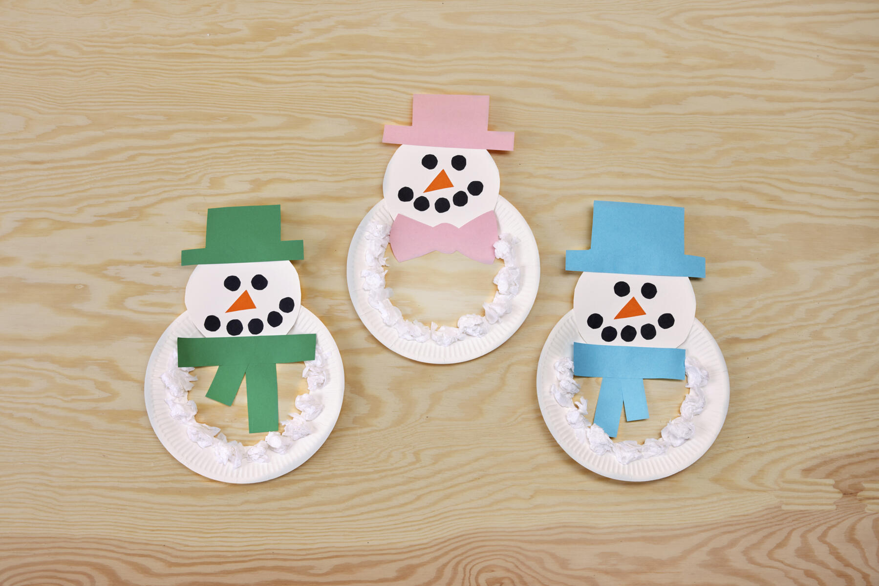 - Find en hvid papirtallerken, og klip midten ud. Brug den udklippede cirkel som hoved til snemanden. Klip hat, halstørklæde, øjne, mund og næse ud af farvet papir efter eget valg.