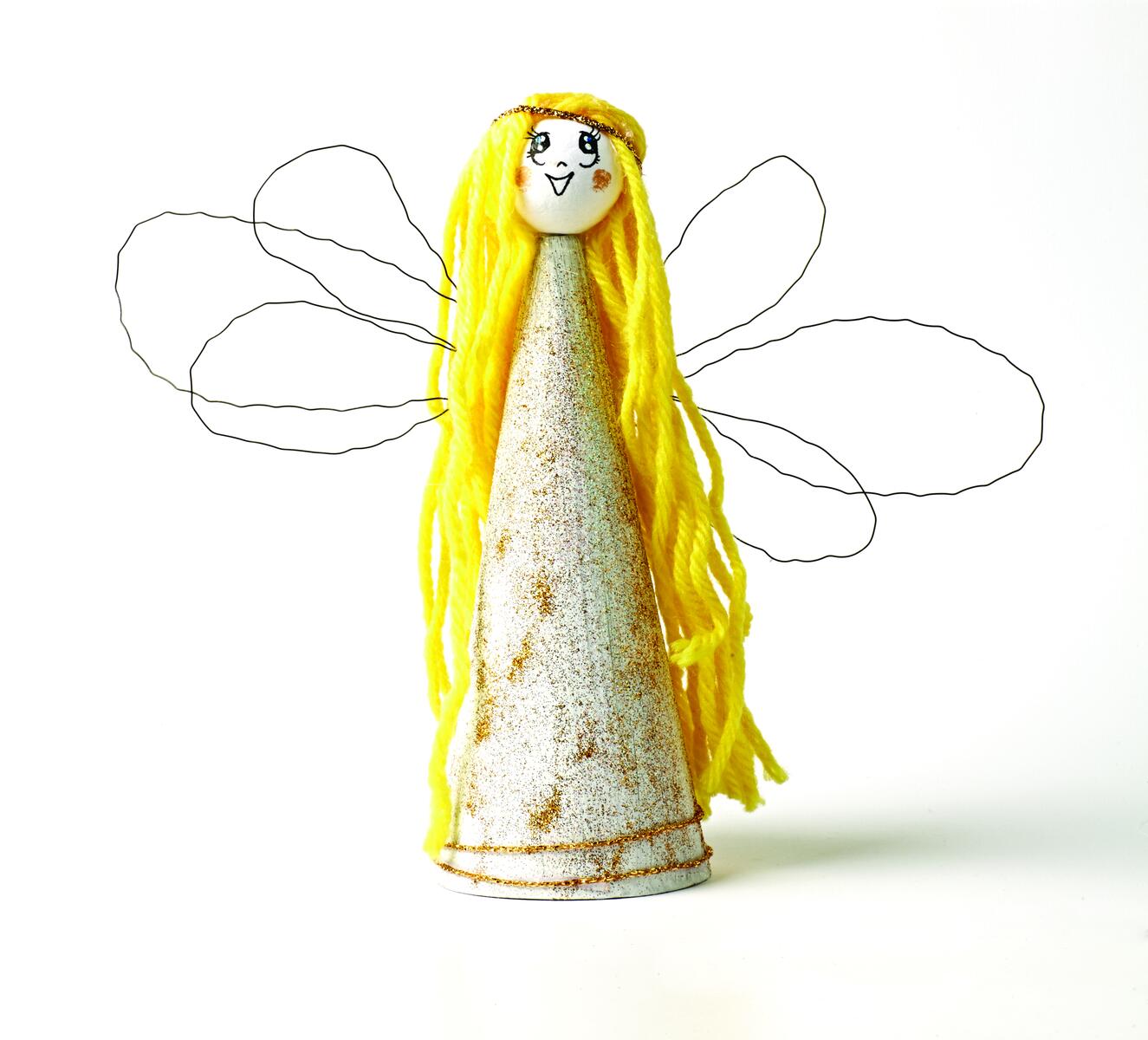 - Brug metaltråd til vinger, buk til tre vinger pr. side af en hel tråd – afslut med at vikle tråden rundt i midten, så der dannes en sløjfe. Lim dem fast på ryggen – her skal bruges limpistol!