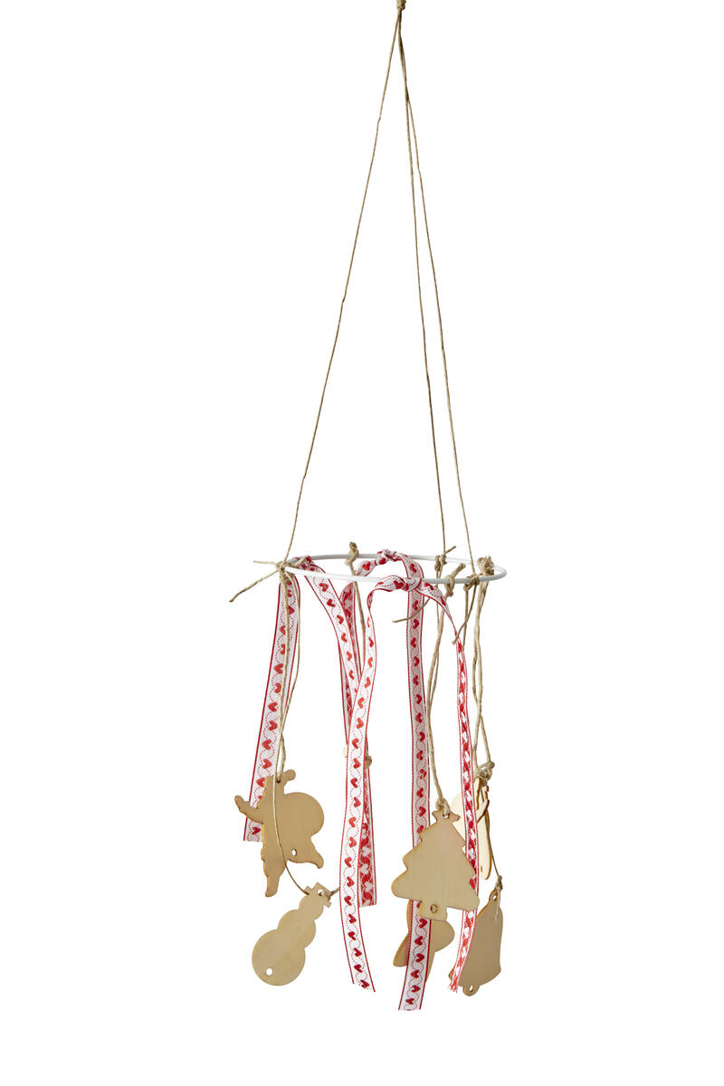 Bind julebånd fast på metalringen mellem de forskellige træfigurer.