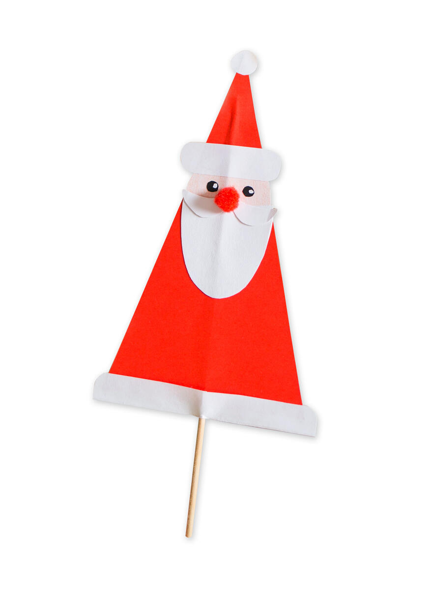 Klip 2 trekanter ud af rødt pap. Lim trekanterne sammen med en blomsterpind imellem. Klip skæg, overskæg, hue og andre detaljer ud, og lim dem på figuren som på billedet.