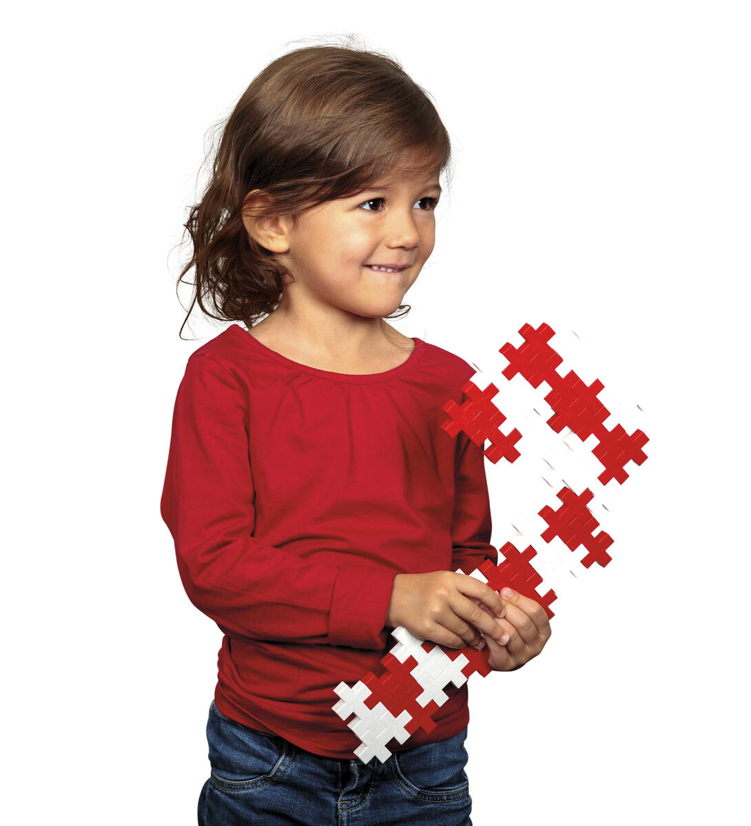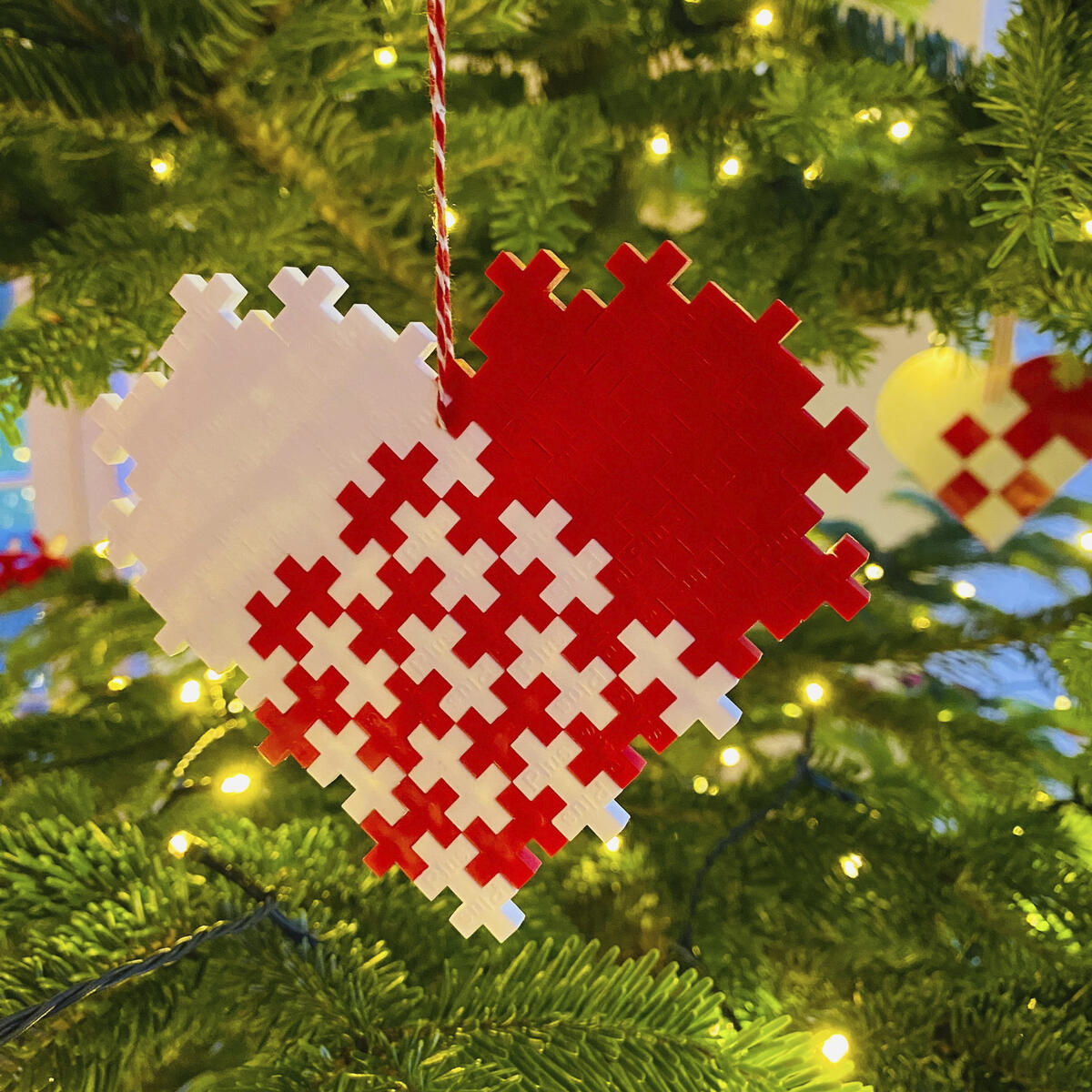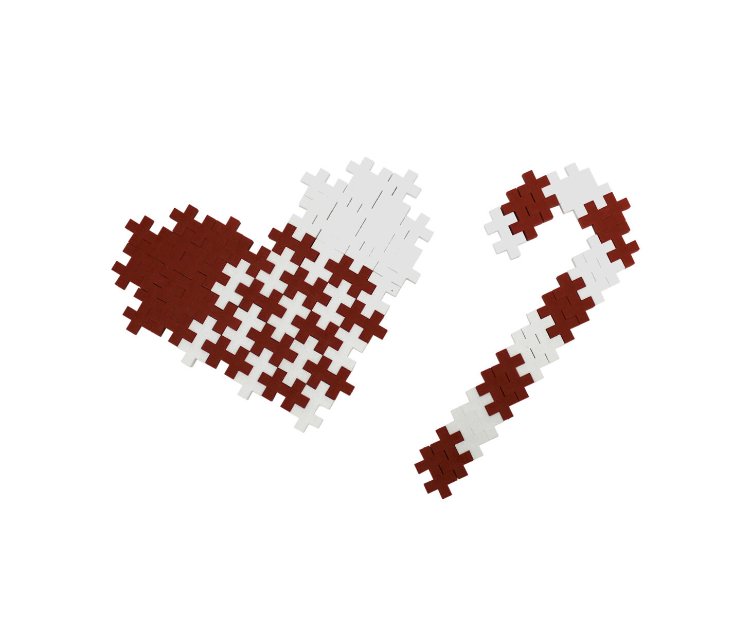 Brug røde og hvide PLUS-PLUS-brikker, og lav julepynt som vist på billedet. Kan bygges med store eller små PLUS-PLUS-brikker.