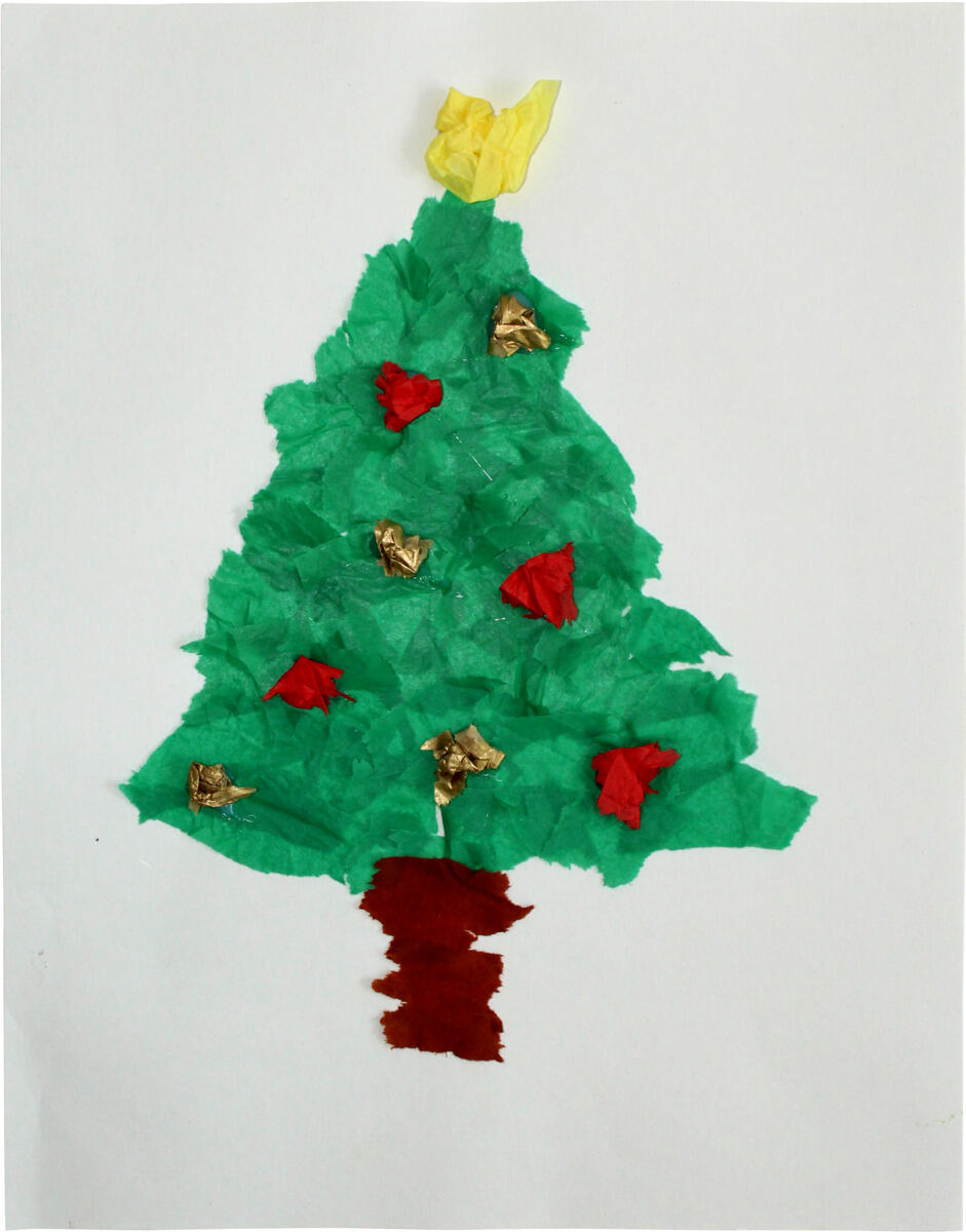 - Riv små strimler af silkepapir, og lim dem fast i form af et juletræ. Gør det samme med stammen.