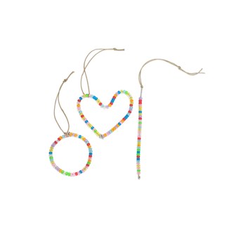 Klip en passende længde aluminiumstråd og lav forskellige figurer (hjerte, cirkel, stjerne osv.) Fyld tråden med perler. Klem tråd-enderne sammen med en tang. Hæng dekorationerne op med sejlgarn/bånd.