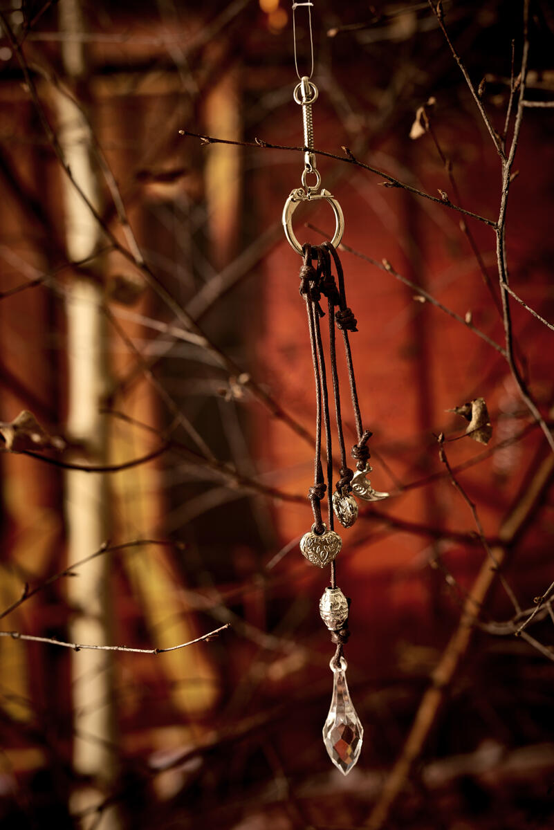 Bind metalperler fast på snor. Bind snoren fast til nøgleringen.