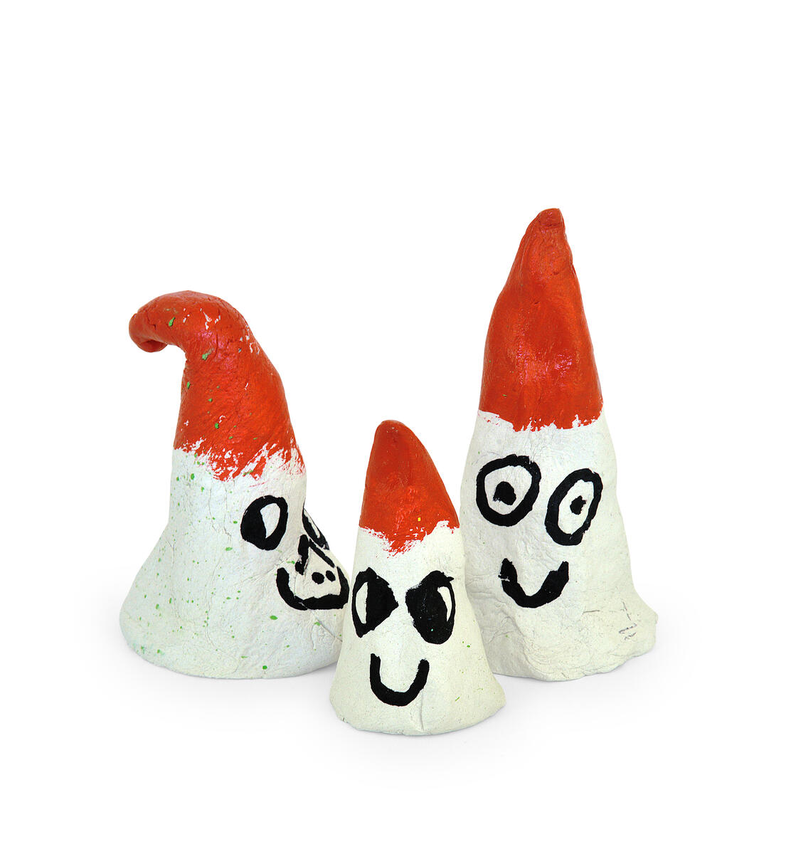 Form leret som kegler. Bøj gerne toppen af keglen som en nissehue. Lad den tørre. Mal/tegn detaljer på nisserne.