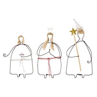 Lucia med krone: Lav hoved og krop af samme elefanttråd. Lav arme og hænder af en anden elefanttråd. Snur armene fast på kroppen med kobbertråd. Flet rød kobbertråd rundt om midten af kroppen. Klip lidt hobbyhår til håret, og lim det fast på hovedet. Luciakronen er lavet af flettet kobbertråd med guldtråd som levende lys.