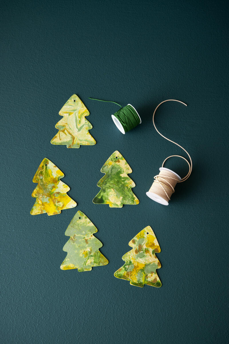 - Dyp juletræet i vandet, så det dækkes af farve. Tag det forsigtigt op, og læg det fladt, indtil det tørrer.