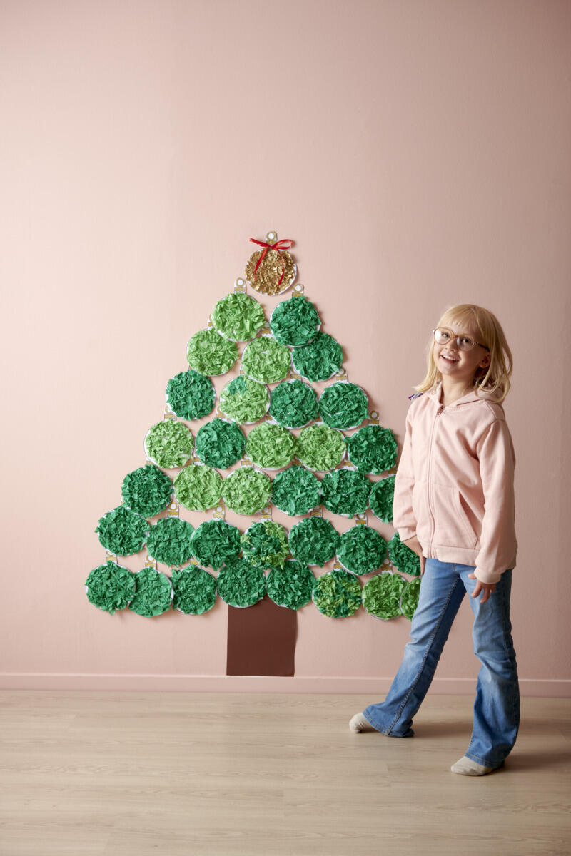 - Lad børnene farvelægge og dekorere kuglerne efter eget ønske og med forskellige materialer. Fastgør derefter børnenes personlige julekugler på væggen med hæftemasse, så de tilsammen danner formen af et juletræ. (Vi har dekoreret med silkepapir og silkebånd).