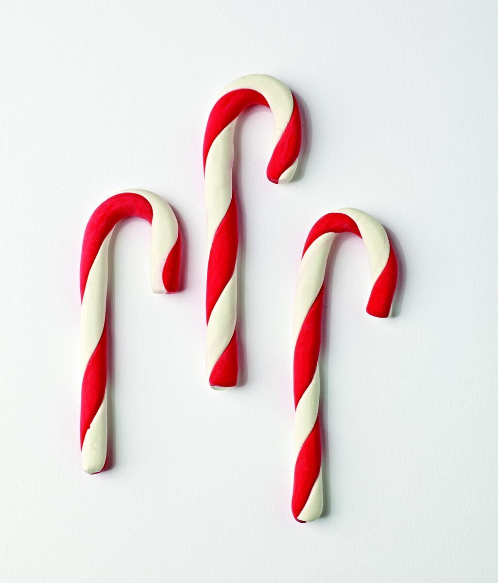 1. Bland rød og hvid modellervoks ved at sno dem sammen. Form derefter massen til slikstokke med den klassiske bøjede top.