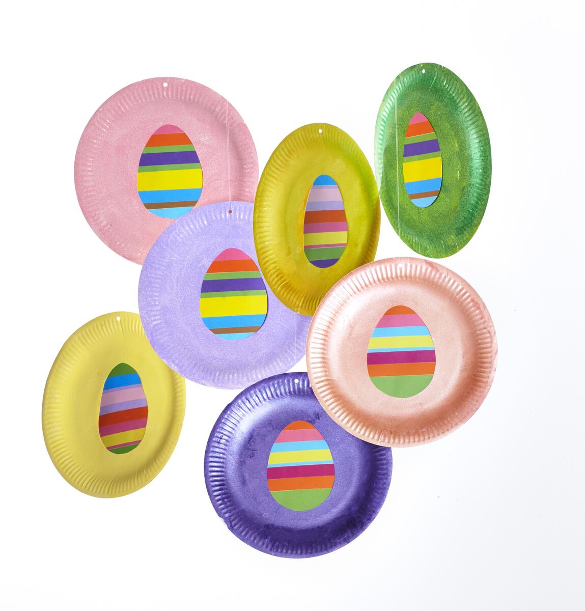 2. Klip et æg ud af det mønstrede hobbypapir, og lim det på paptallerkenen.