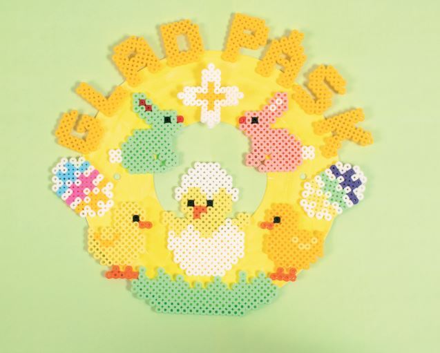 - Lav en krans af en paptallerken eller dekorationspap, og lim perlefigurerne på.