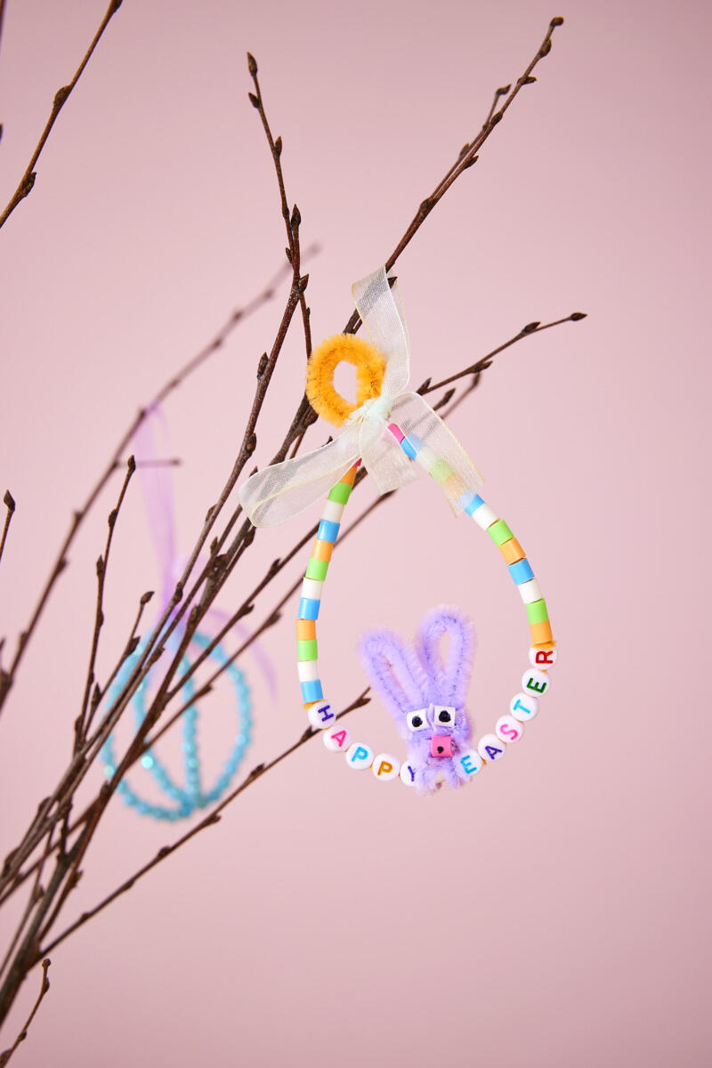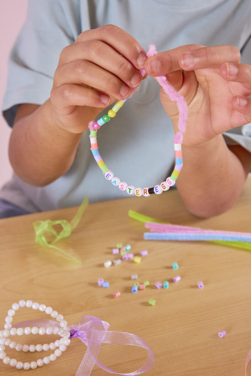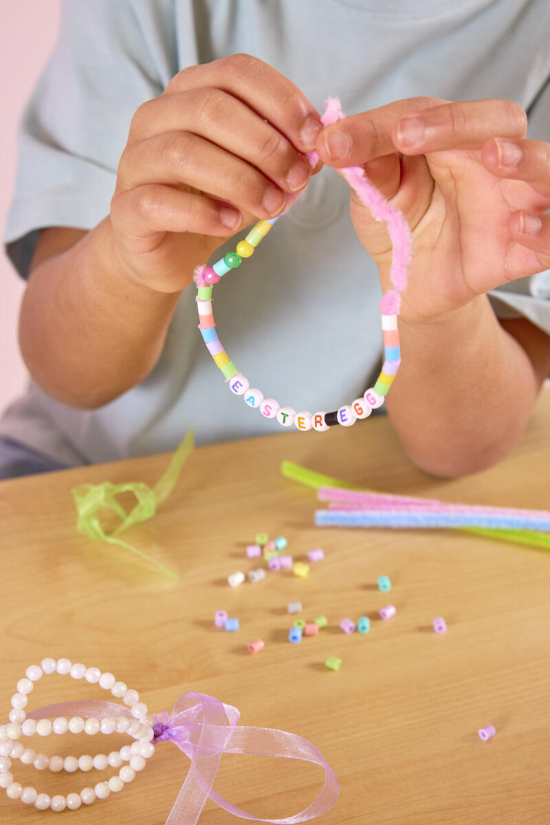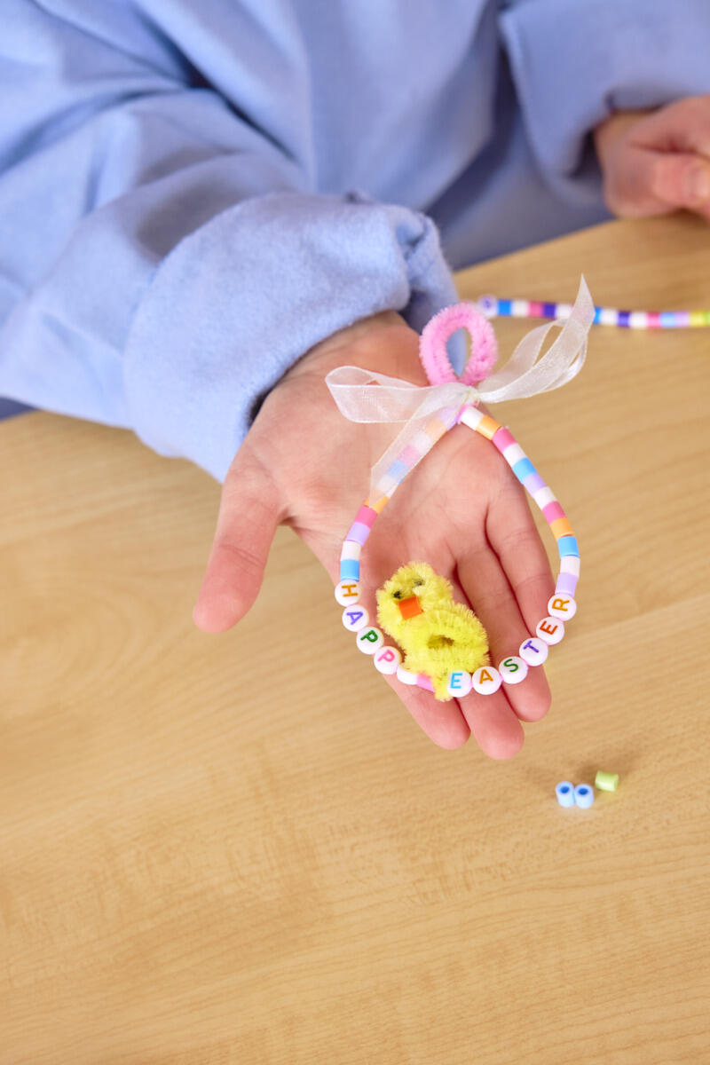 - Tag en piberenser, og træk rørperler og bogstavperler på. Eleverne kan skrive en kort påskehilsen eller deres egne ord, hvilket samtidig giver en naturlig anledning til at øve bogstaver og sproglig opmærksomhed. Husk at lade lidt plads være fri i enderne, så de kan tvindes sammen. Form piberenseren som et æg, og tvind den sammen i toppen.