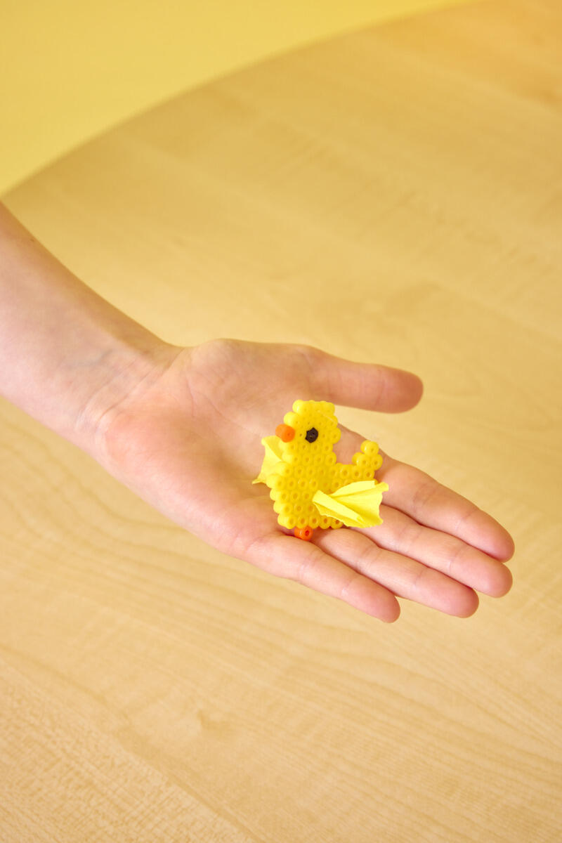 - Læg bagepapir over, og stryg med et strygejern, indtil alle perlerne er smeltet sammen. OBS! Få hjælp af en voksen, når der skal stryges. Både strygejern og perler bliver meget varme. Læg noget tungt ovenpå, og lad det køle af. Hvis man vil undgå varme, kan man i stedet bruge limark til at holde perlerne sammen.