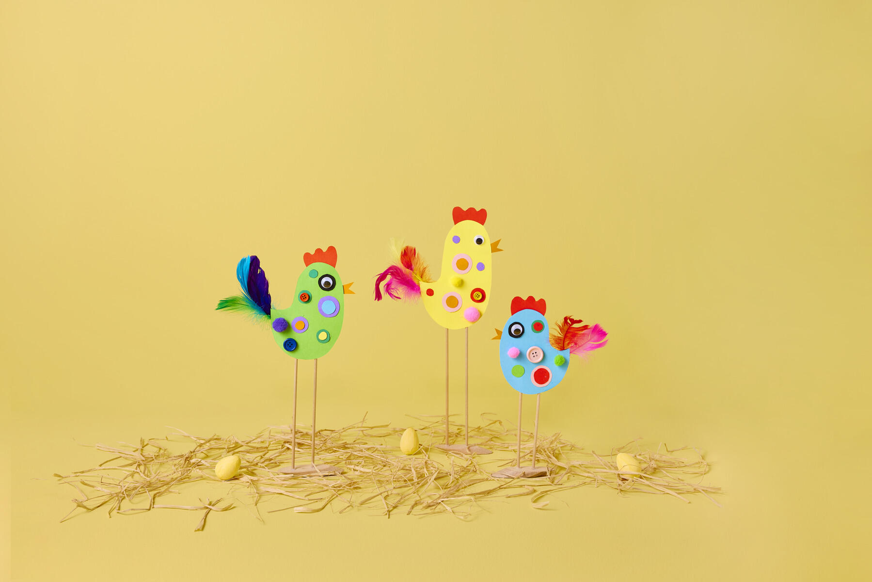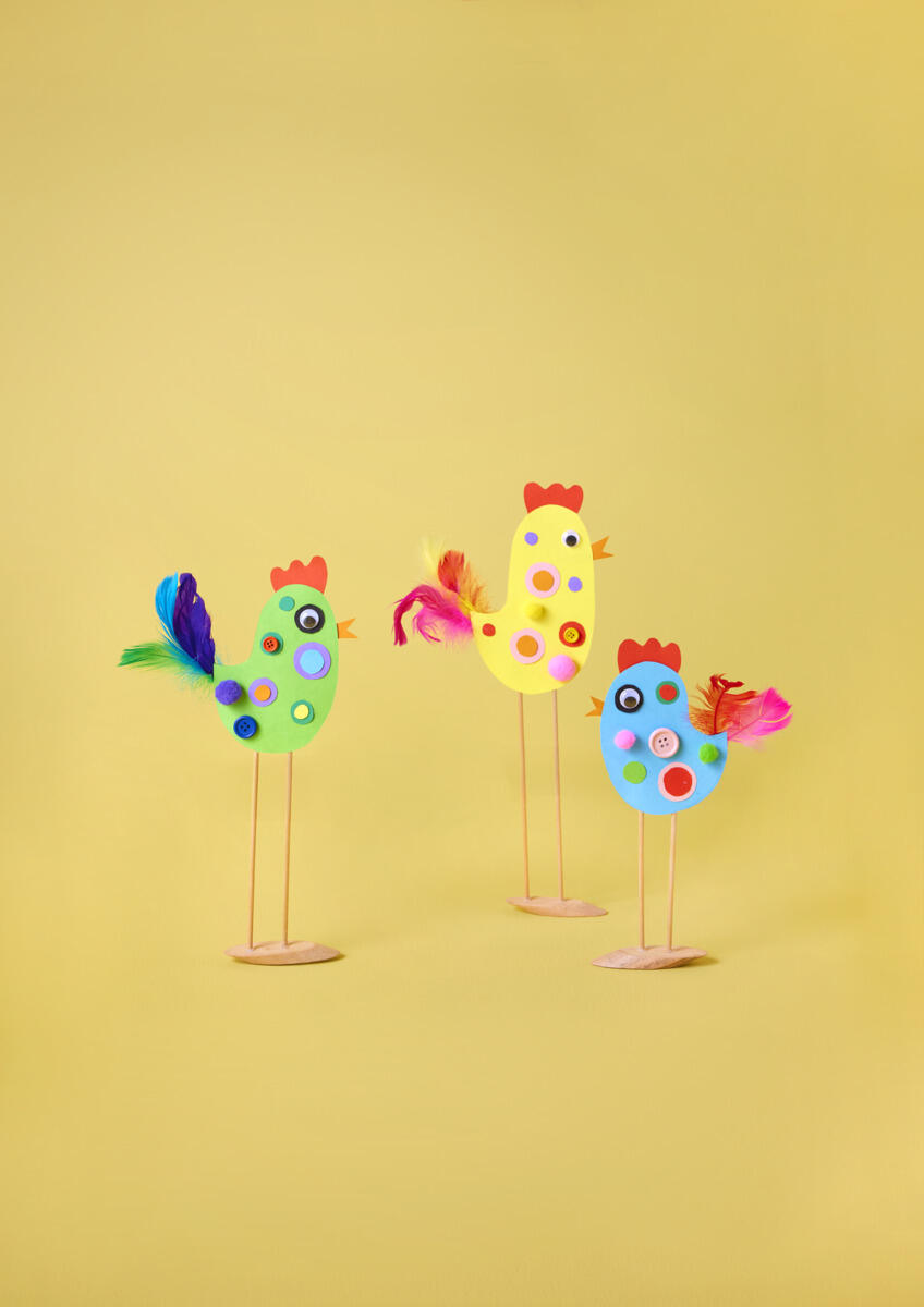 - Klip et næb ud, og brug et stift materiale som fx dekorationskarton eller filt til at klippe kammen. Placer og lim det hele fast på den ene skabelon: næb, kam og fjer. Knæk blomsterpinde i den ønskede længde til ben, og lim dem fast i bunden. Lim eller hæft kroppen sammen.
