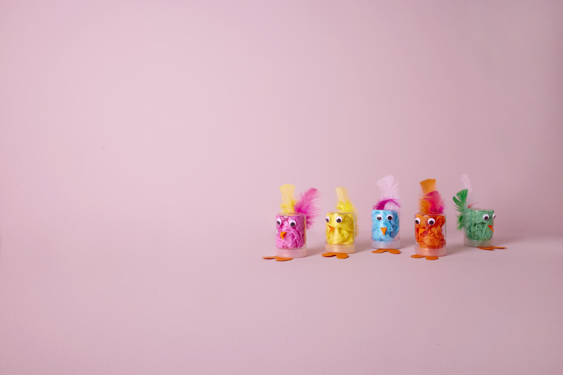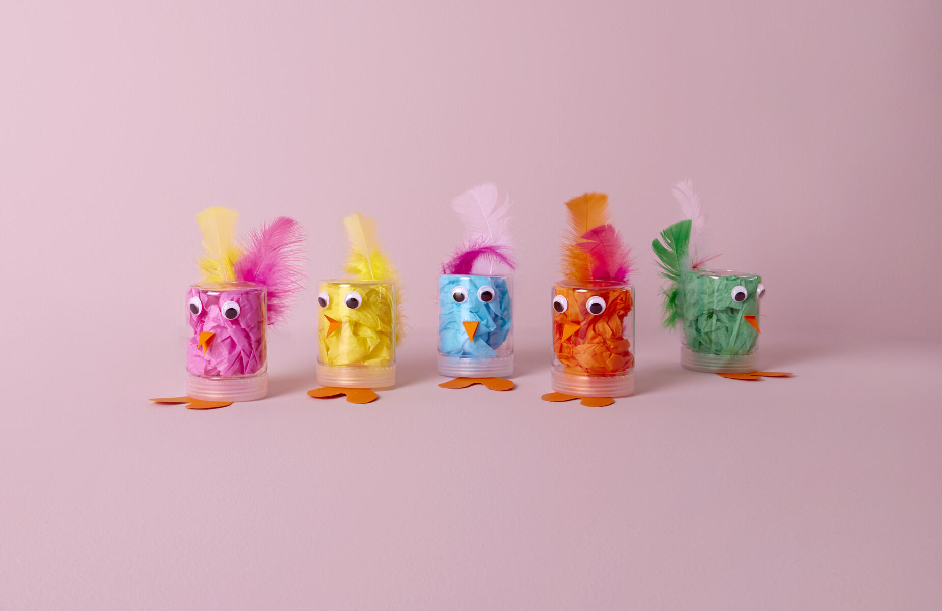 - Lim plastøjne på bøtten, og sæt en eller flere farverige fjer fast på bagsiden.
