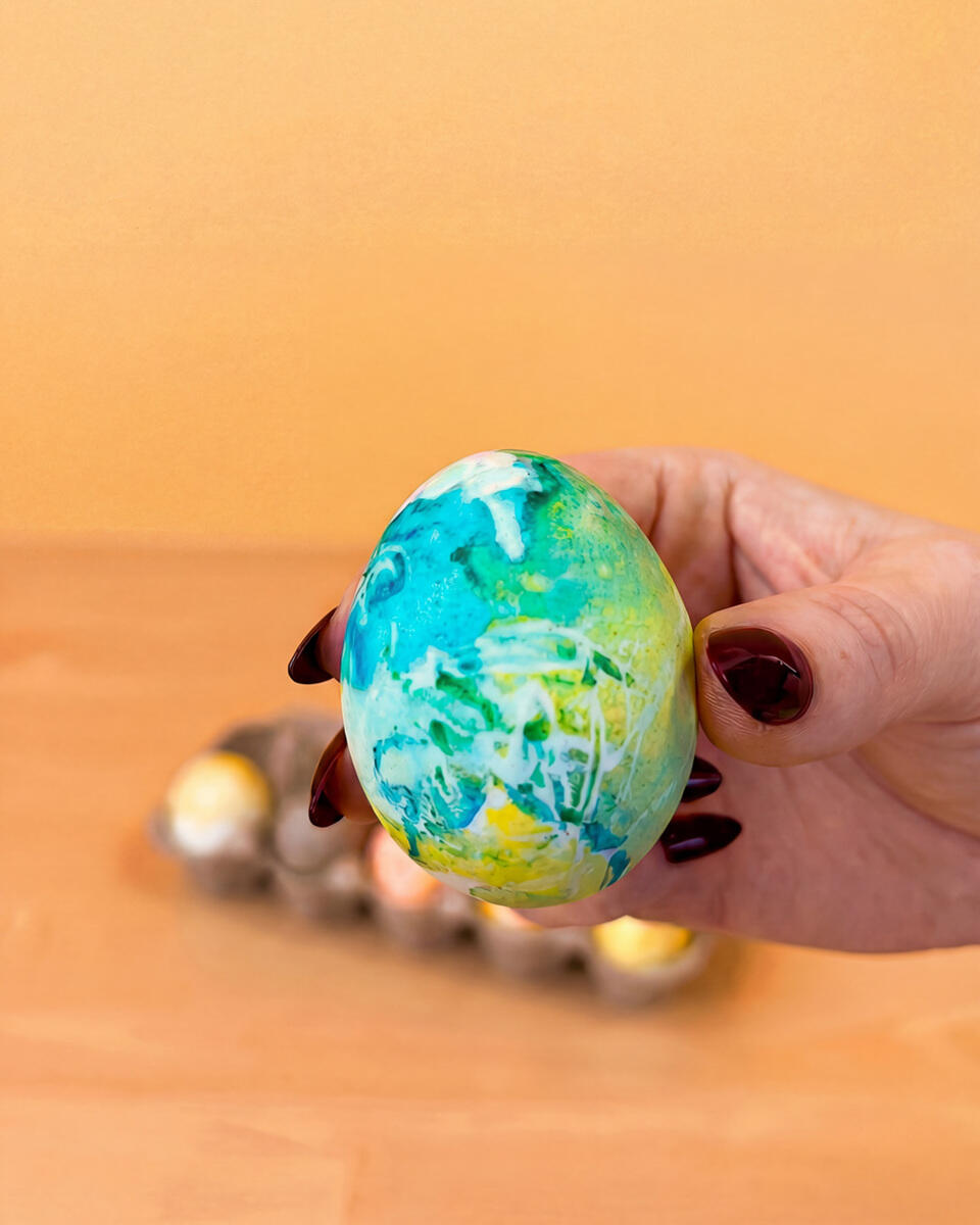 - Tag æg frem, og mal med boblerne direkte på ægget, eller rul ægget i boblerne. Lad det tørre.
