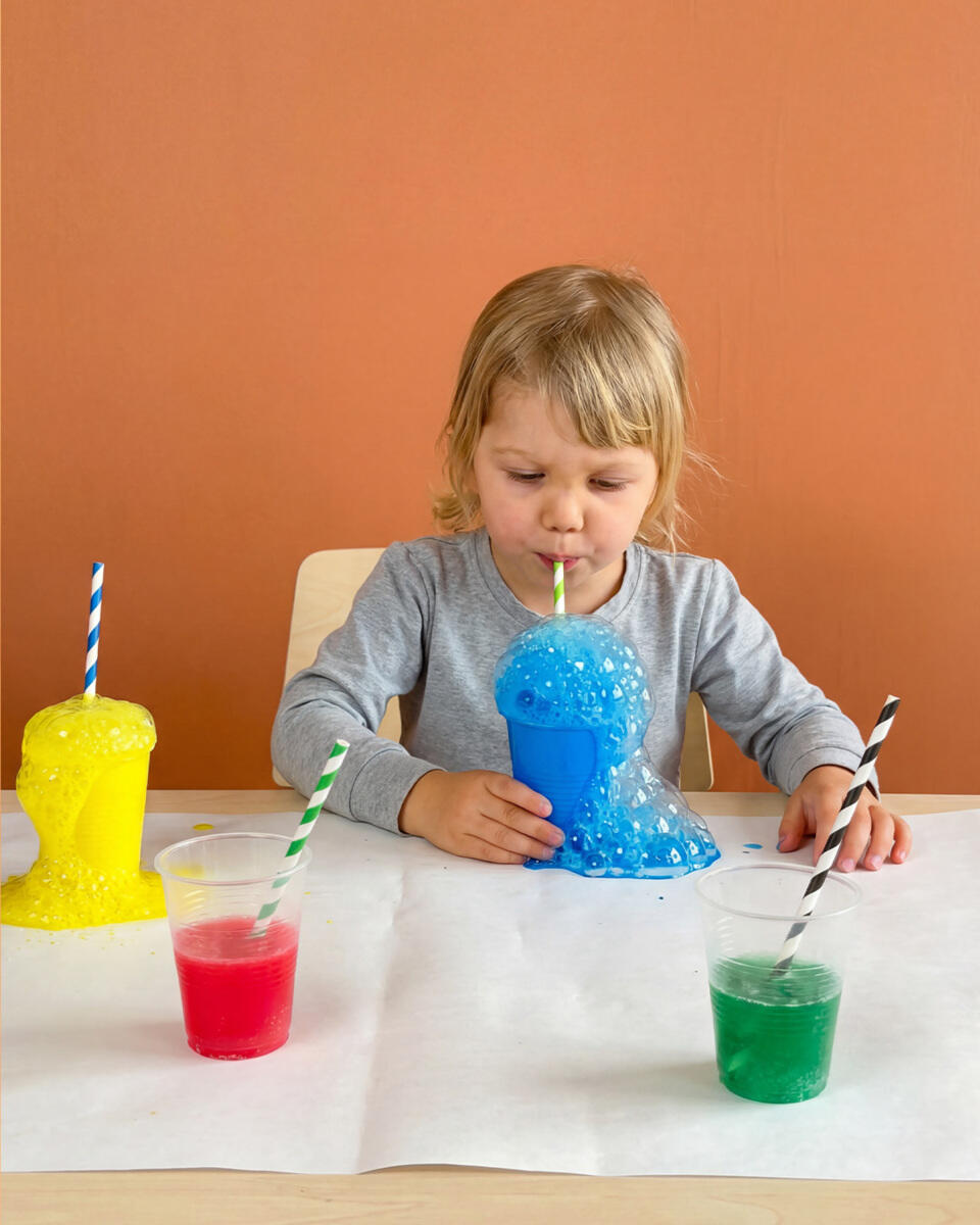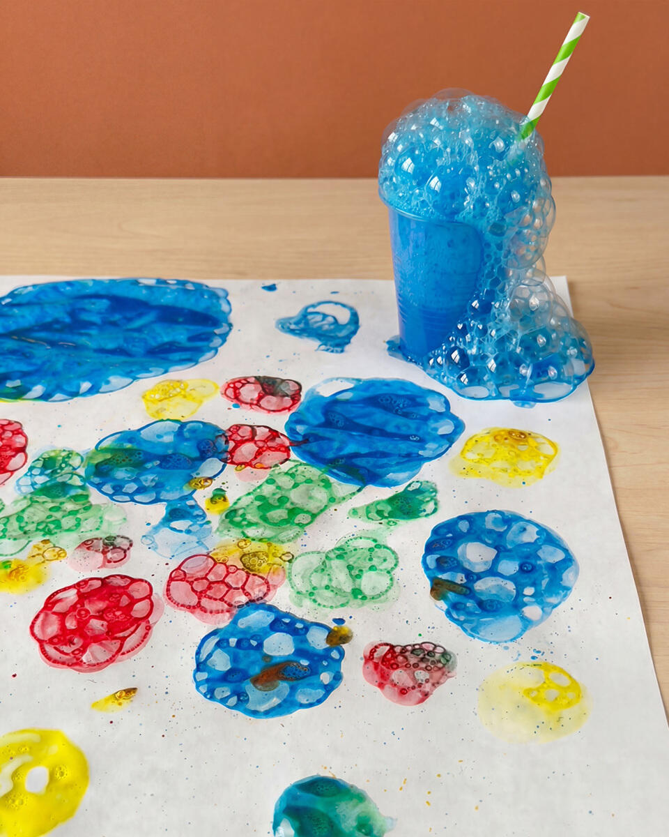 - Bland farven i små kopper med lidt vand, til den bliver letflydende. Jo mere vand, desto flere bobler. Læg et stykke papir foran barnet på en beskyttet overflade.
