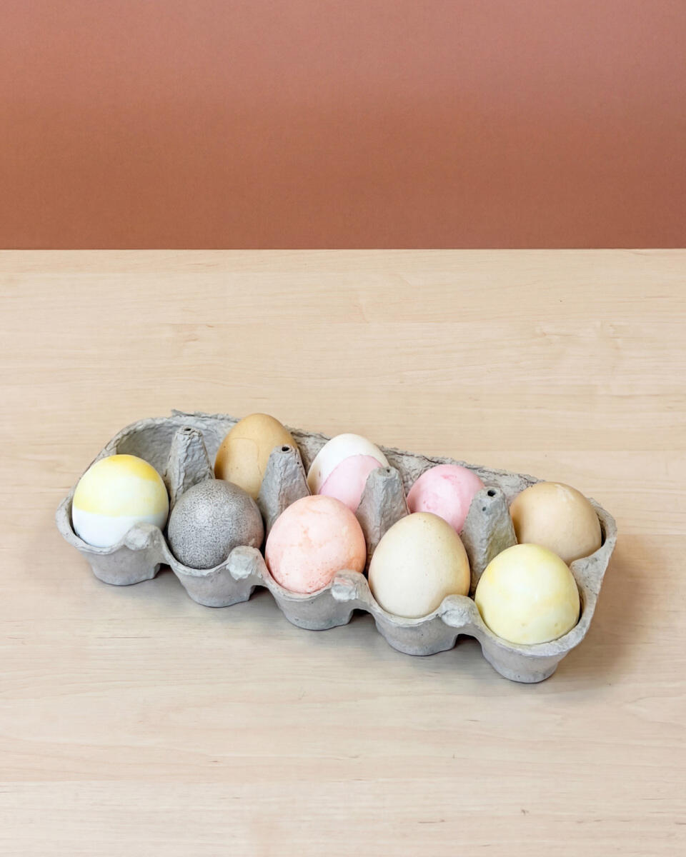 - Vil du have fine mønstre på æggene? Sæt papirtape på i mønstre, inden de lægges i farvebadet. Fjern tapen, når farven er helt tør.