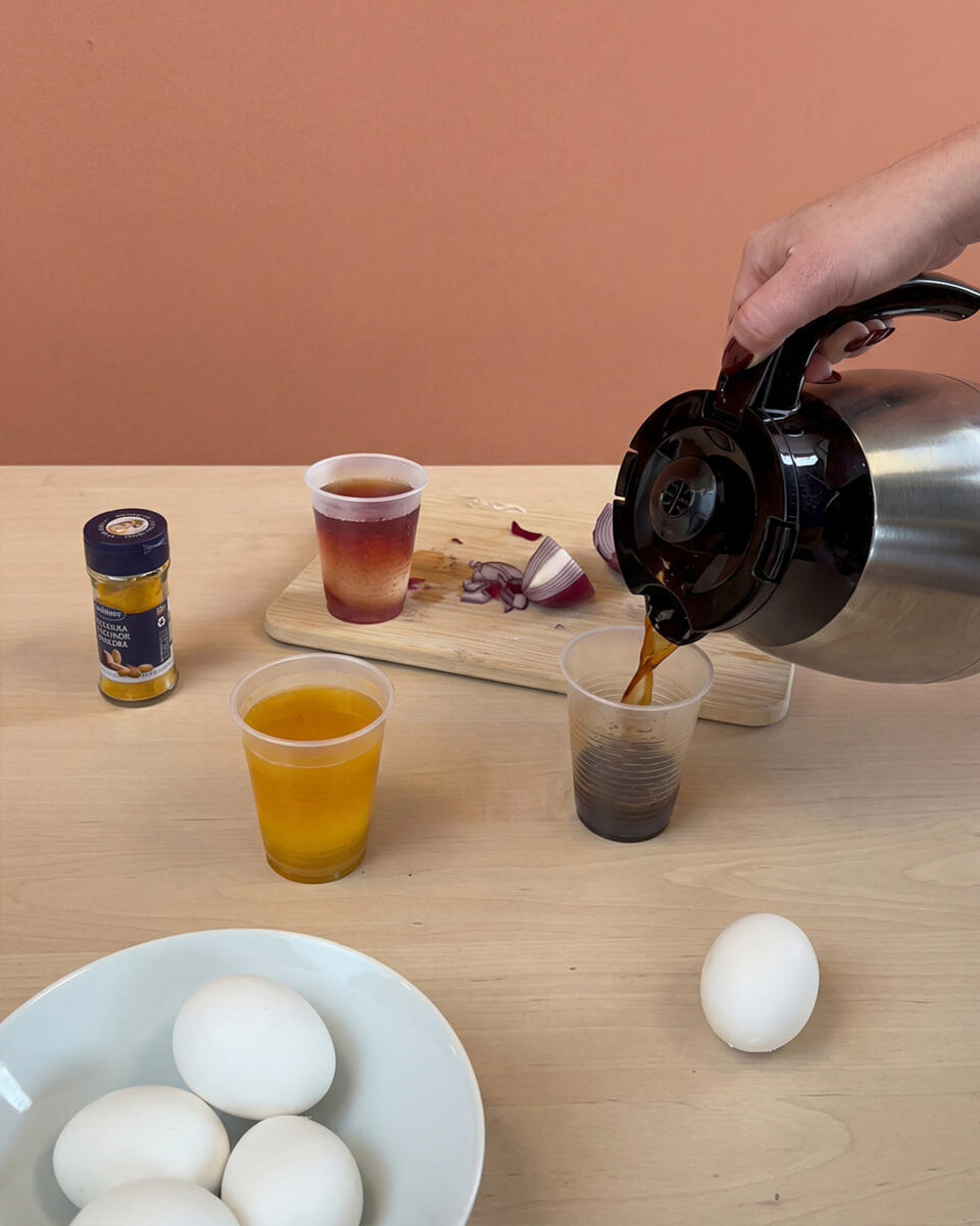 - Kog æggene som normalt. Vælg en naturlig råvare med en kraftig farve, fx blåbær, rødløg, gurkemeje, rødbede eller kaffe.